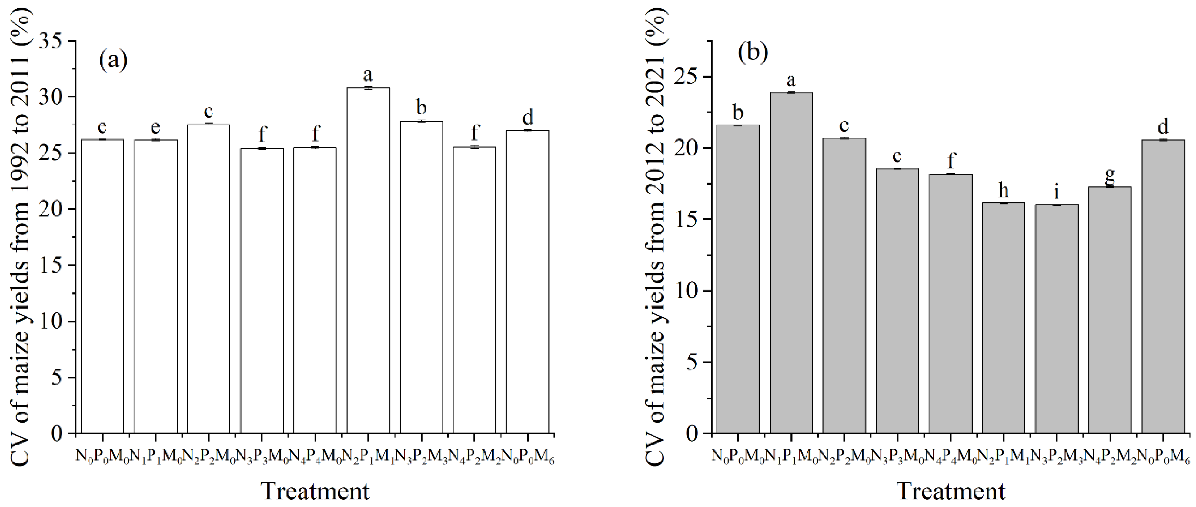 Since planting density increased in 2012, the interannual coefficient variation (CV) of yield was analyzed into two periods: 1992–2011 and 2012–2021. As shown in Figure 3, the CV from 2012 to 2021 (16.1–23.9%) was much lower than from 1992 to 2011 (25.4–30.8%). From 2012 to 2021, the CV of maize yield was significantly reduced under different fertilization regimes: by 4.1–15.9% with chemical fertilizer alone, by 19.9–25.9% with the combined application of chemical fertilizer and cattle manure, and by 4.7% with the application of a high rate of cattle manure.