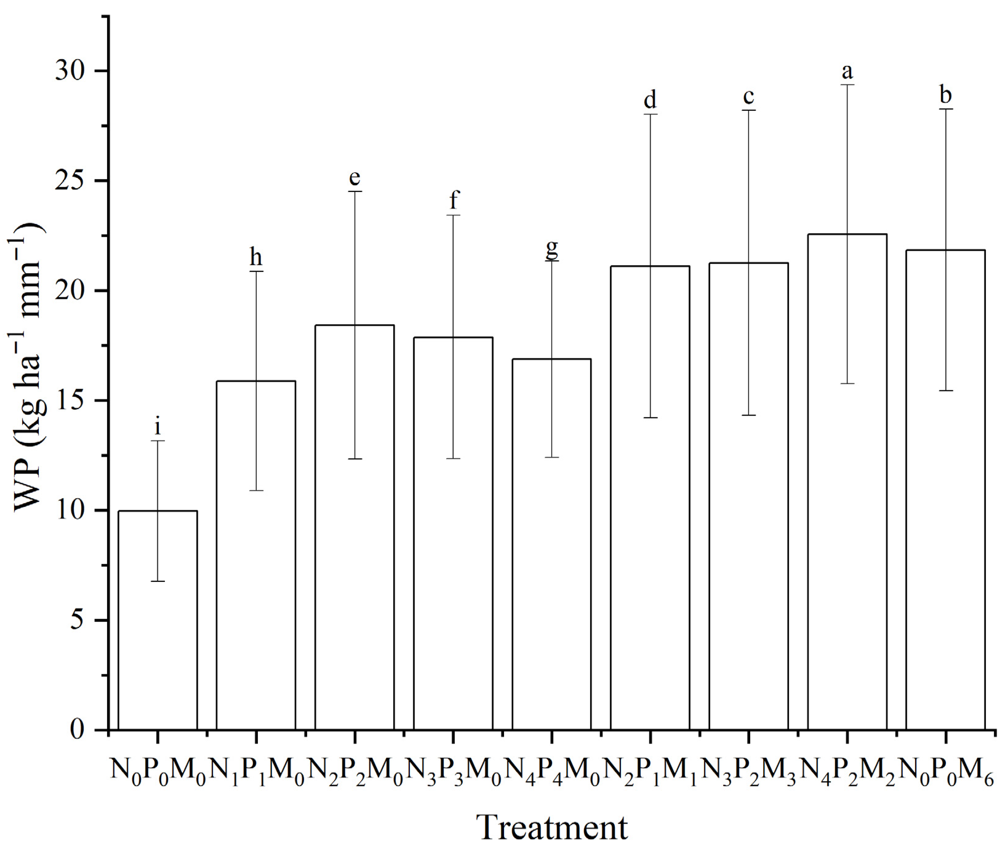 Fertilization significantly increased WP in all precipitation patterns (Table 5), with the trends in WP for each precipitation pattern being similar to that of the average WP over the 30 years. The increasing rate of WP compared with the no fertilizer control was the highest in the N4P2M2 treatment except in very wet years, in which case it was highest in N0P0M6. The rate of increase in WP with fertilizer under different precipitation patterns followed the order: relatively dry year > very wet year > normal year > relatively wet year > very dry year.