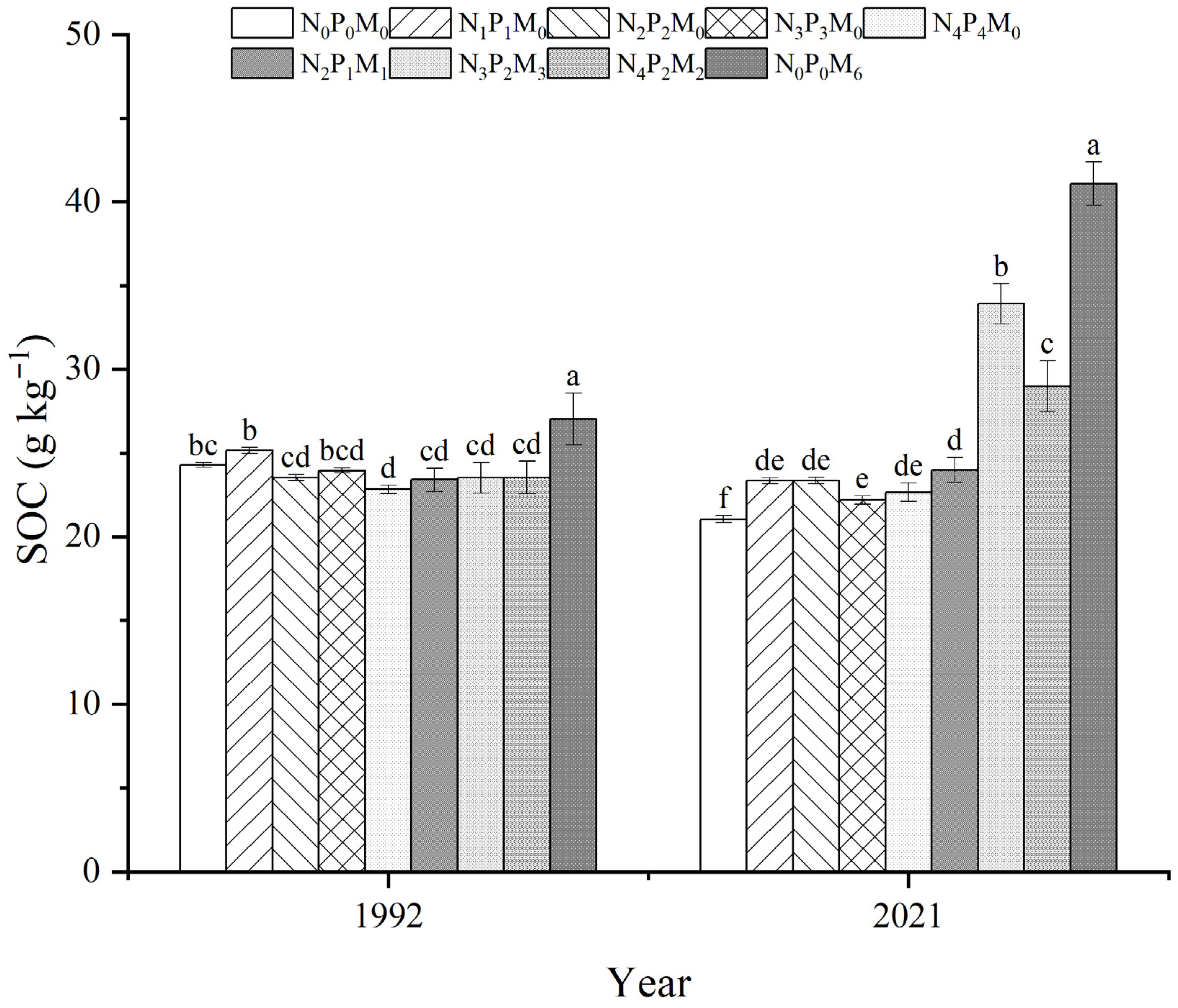 The SOC content under different treatments in 1992 and 2021 is shown in Figure 5. The SOC content in the N0P0M0 treatment was 13.4% lower in 2021 than in 1992, while in the chemical fertilizer treatments was 0.7–7.3% lower in 2021 than in 1992. In contrast, the SOC content in the combined chemical fertilizer and cattle manure treatments was 2.3–44.1% higher in 2021 than in 1992. The N0P0M6 treatment resulted in the highest SOC content (41.09 g kg−1), which was higher than that in 1992 by 52.0%. In 2021, treatments with cattle manure generally had higher SOC contents than those with chemical fertilizers alone. N3P2M3 and N4P2M2 had significantly higher SOC than N2P2M0 by 45.2% and 24.0%, respectively. The N0P0M6 treatment had 75.9% higher SOC than the N2P2M0 treatment.