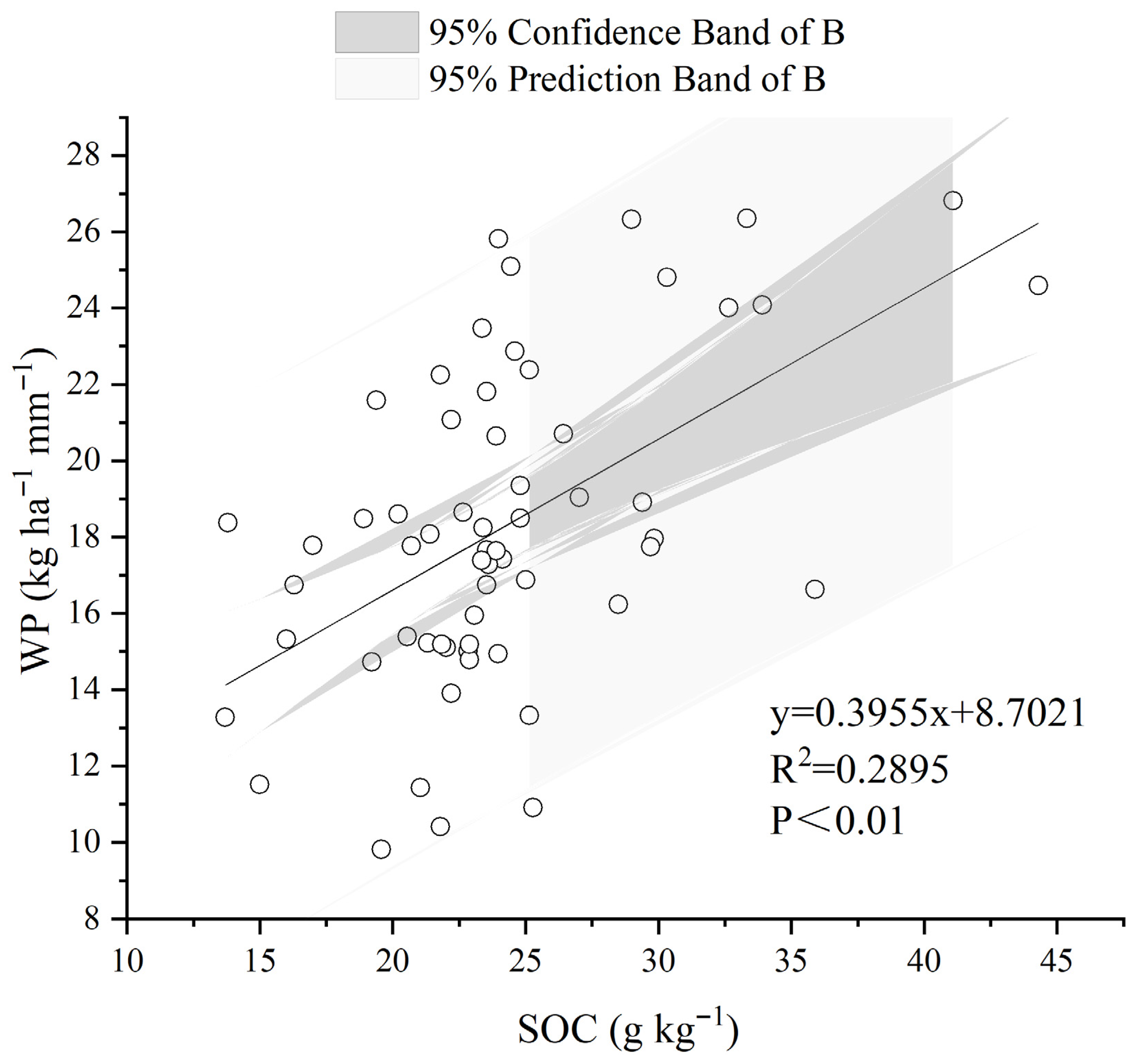 Pearson’s correlation analysis (Table 7) showed that the average yield was significantly positively correlated with SOC, WP, and water consumption during growth (p < 0.01). SOC was also significantly positively correlated with WP (p < 0.01). In contrast, WP was negatively correlated with water consumption during growth. Linear regression analysis of SOC and WP (Figure 6) showed that for every unit increase in SOC, the WP increased by 0.3955 kg ha−1 mm−1.