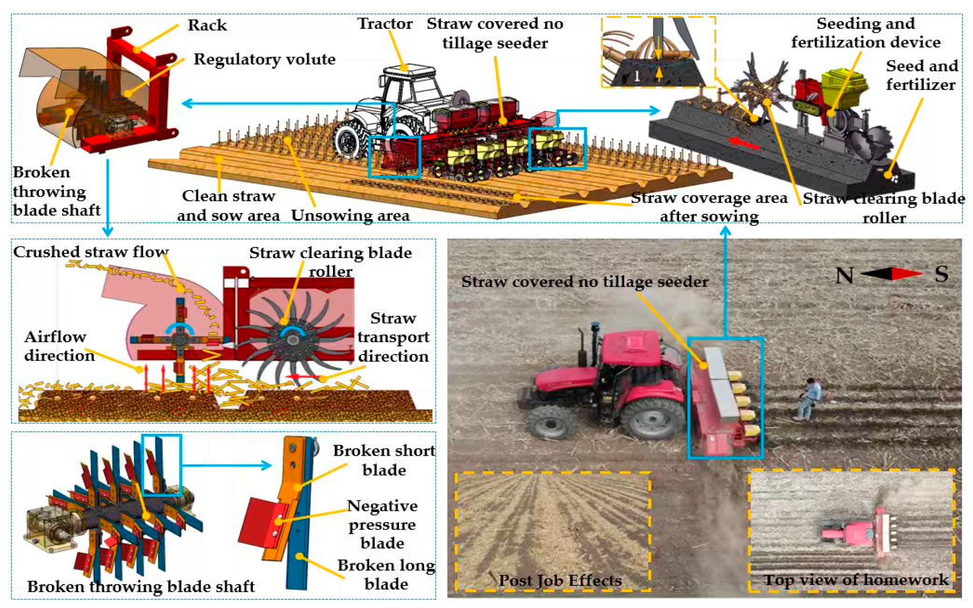 | Straw returning fertilizer seeder with crushing and spreading device | Balance straw incorporation with machinery passability. | Large amounts of straw thrown backward can easily increase the risk of clogging | Controllable and directional blockage-reducing dispersal |
