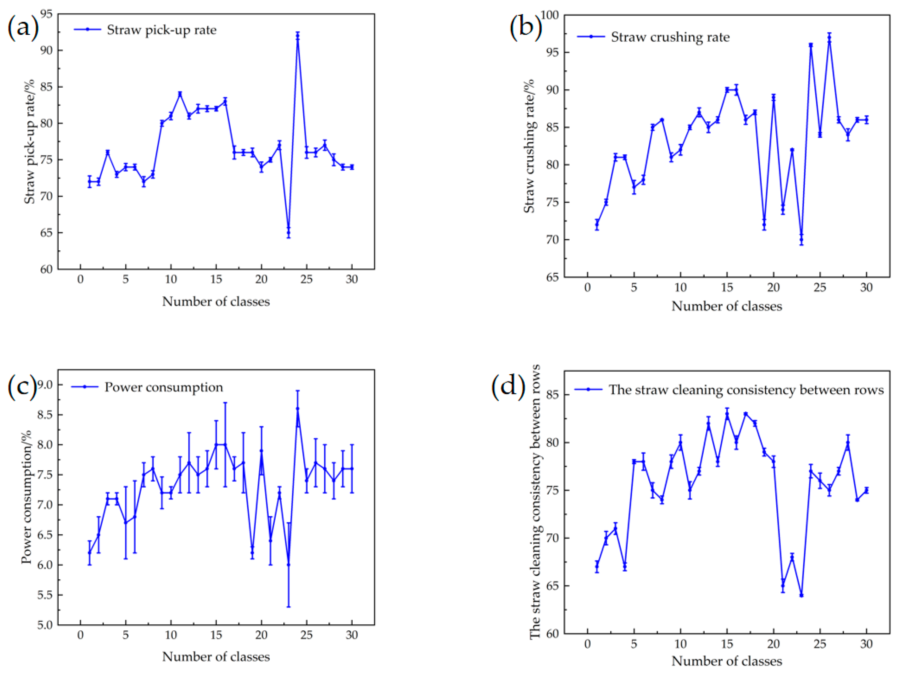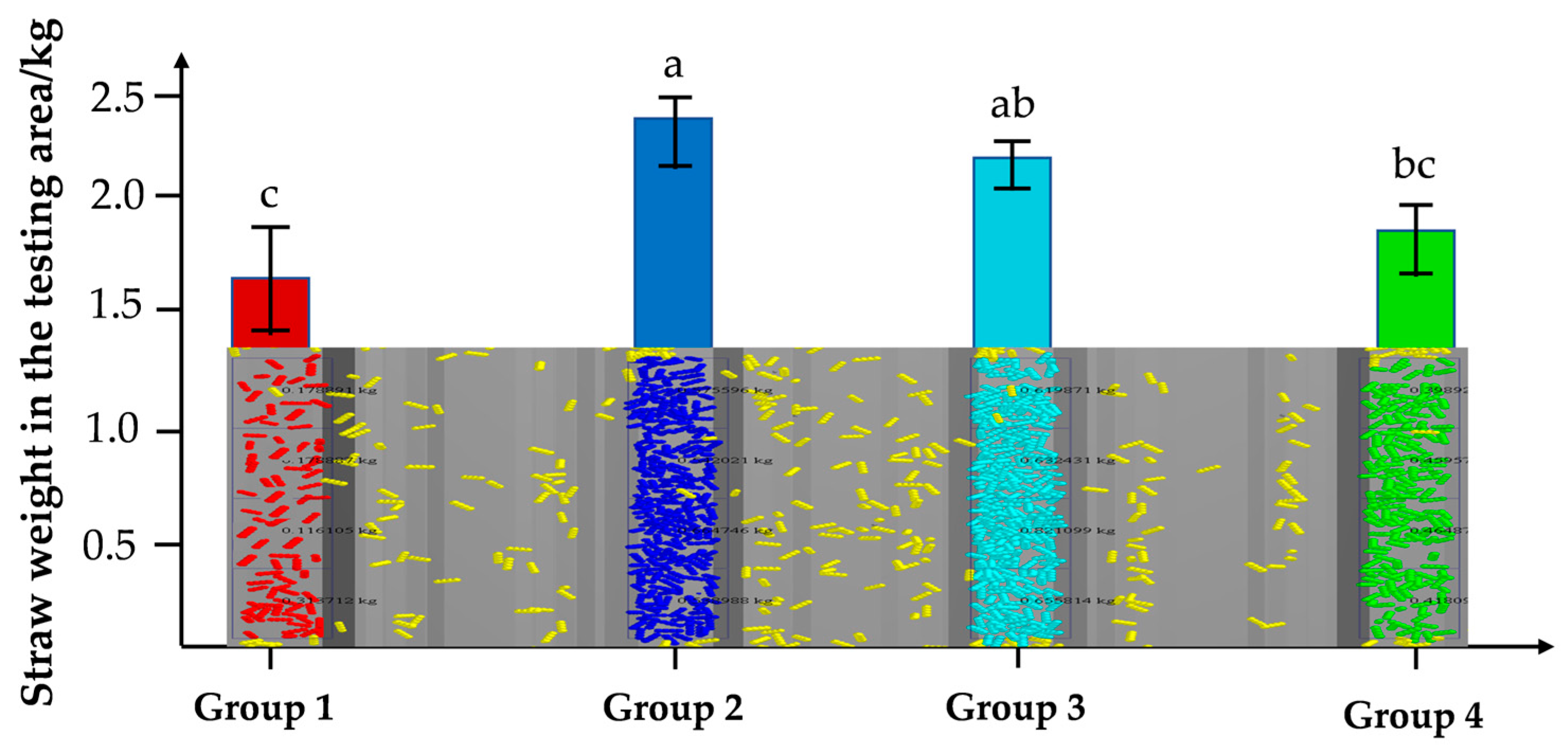 - A prototype was manufactured based on the optimization results, followed by field validation tests. The results demonstrate that under the optimal parameter combination, the straw pick-up rate exceeds 87%, the straw crushing rate surpasses 81%, power consumption remains below 7.7 kW, the straw cleaning consistency approaches 80%, and the maximum lateral throwing distance reaches 6300 mm. These outcomes not only satisfy practical operational requirements but also validate the reliability of the simulation optimization results.
