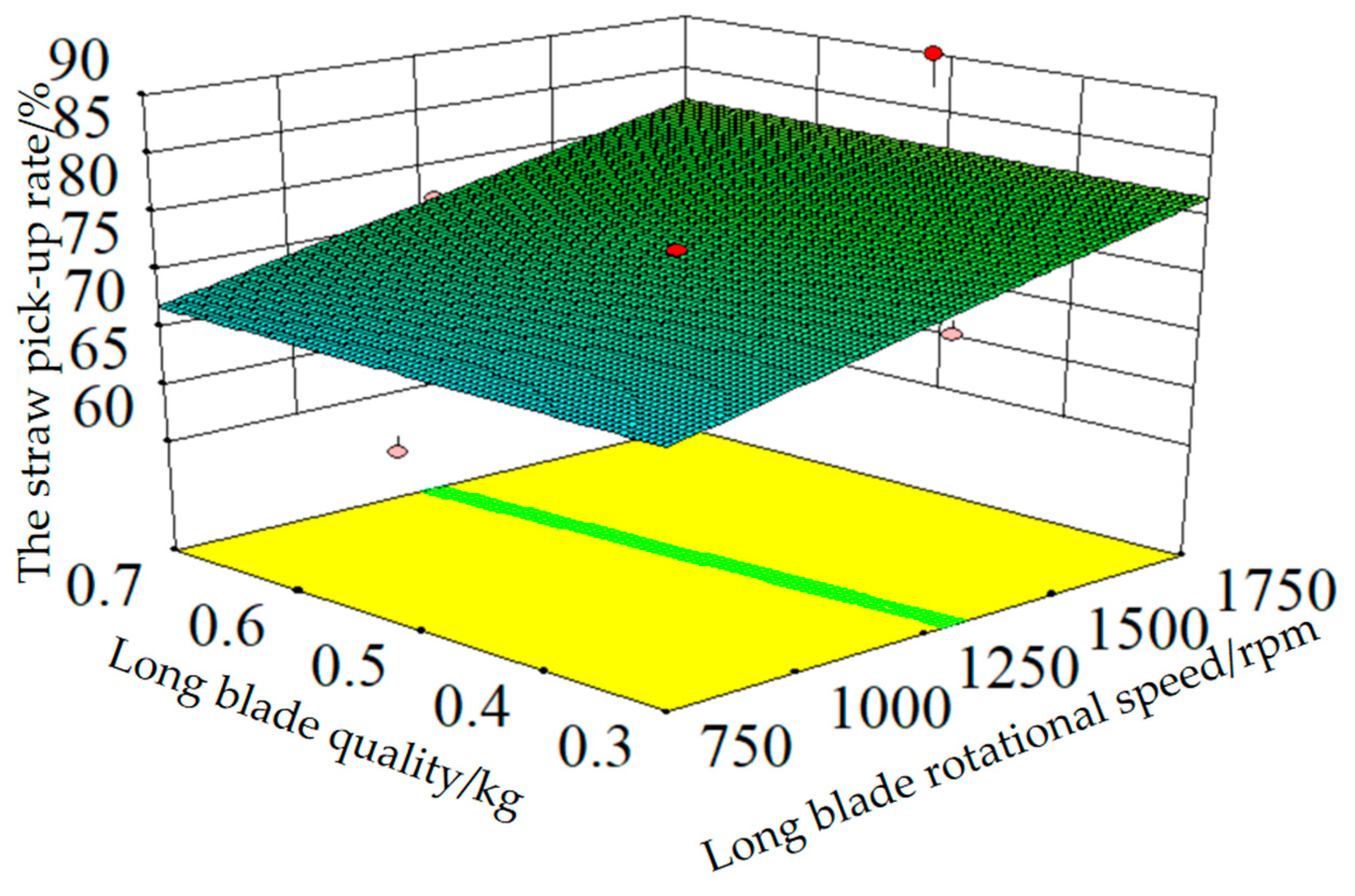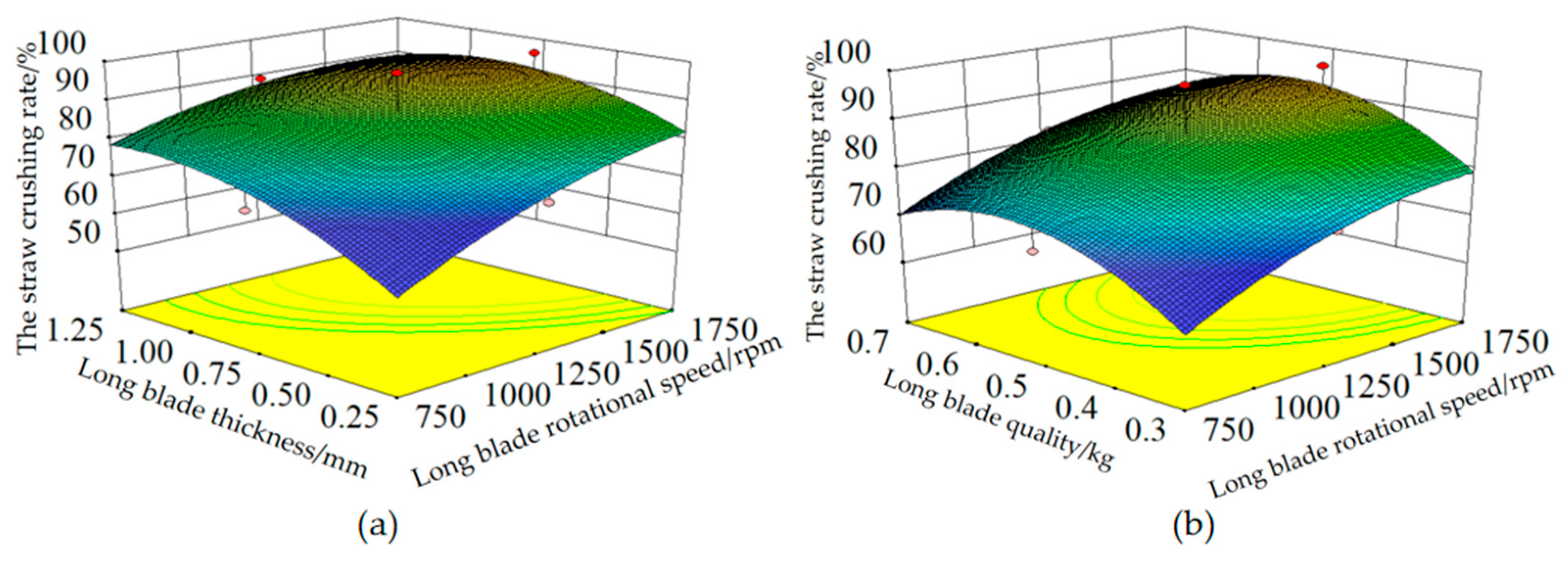 - A straw–soil–machine simulation model was established using the Discrete Element Method (DEM), and virtual simulation experiments, and optimization of key parameters were conducted by employing the Response Surface Methodology (RSM). Performance evaluation indicators, such as straw pick-up rate, crushing rate, power consumption, and inter-row straw coverage consistency, were utilized to derive the optimal parameter combination: a crushing long blade edge angle of 25°, a crushing long blade edge thickness of 1.25 mm, a crushing long blade weight of 0.35–0.41 kg, and a crushing long blade rotational speed of 1400–1750 r/min.