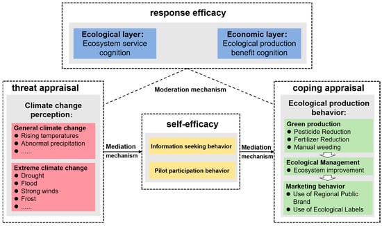 This study applies Protection Motivation Theory (PMT) to explain how climate change perceptions drive the adoption of ecological production behavior (EPB) among tea farmers in high-ecological-value regions. PMT proposes that protective actions arise from two cognitive processes: threat appraisal and coping appraisal [,]. Threat appraisal involves assessing the severity of a risk and one’s vulnerability to it, while coping appraisal evaluates both the effectiveness of a protective response (response efficacy) and the ability to perform it (self-efficacy). When both appraisals are strong, protective motivation emerges. This framework helps clarify why awareness of climate change sometimes leads to ecological adaptation but often stops at concern.