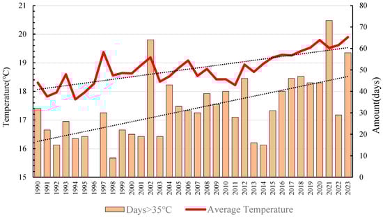 Changing trends of average temperature and number of extremely high temperature days in Wuyi Mountain (1990–2024). The dashed lines show the projected future trend based on current data.