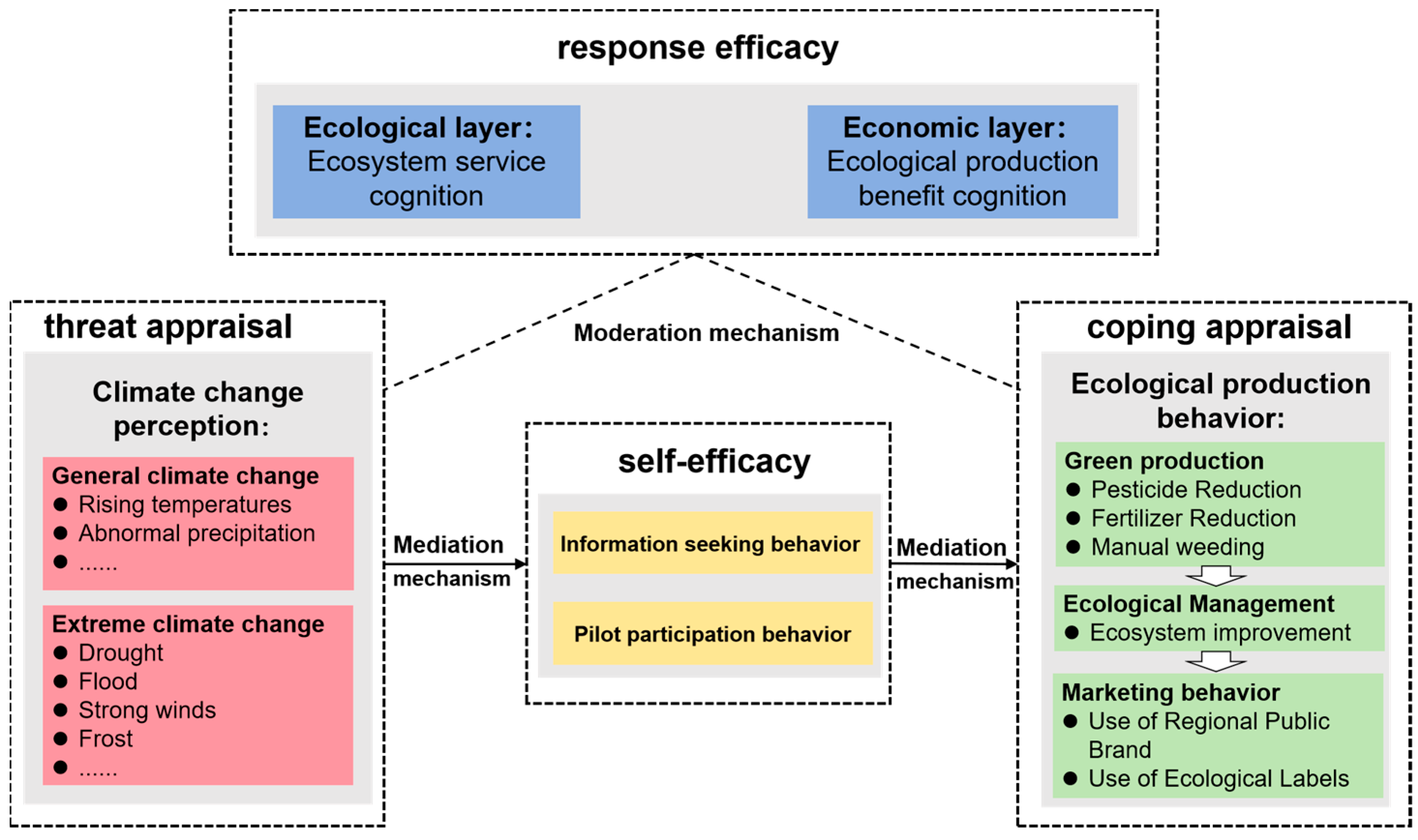 The results of this study show that climate change perceptions are important drivers of farmers’ ecological production behaviors in ecologically sensitive regions. Both general and extreme climate perceptions significantly promote EPB adoption, with ecosystem service cognition and ecological production benefit cognition serving as key moderating factors. Information-seeking and policy participation function as critical mediating pathways that translate climate awareness into ecological actions. These findings deepen theoretical understanding by clarifying how climate perceptions shape ecological behavior through distinct cognitive and institutional mechanisms supported by measurable empirical effects and extend the application of Protection Motivation Theory (PMT) to ecological production decisions. Given that farmers still face learning and certification costs when adopting EPB, institutional support is crucial for securing net benefits over conventional practices. For high ecological value regions such as protected areas, policy interventions should actively create enabling environments that facilitate production system transformation toward ecological approaches. This institutional foundation enables farmers to recognize ecosystem service benefits and adopt ecological production behaviors as rational climate responses. Our findings suggest significant potential for replicating this approach across ecologically sensitive agricultural landscapes globally, provided that appropriate institutional and market frameworks are established.