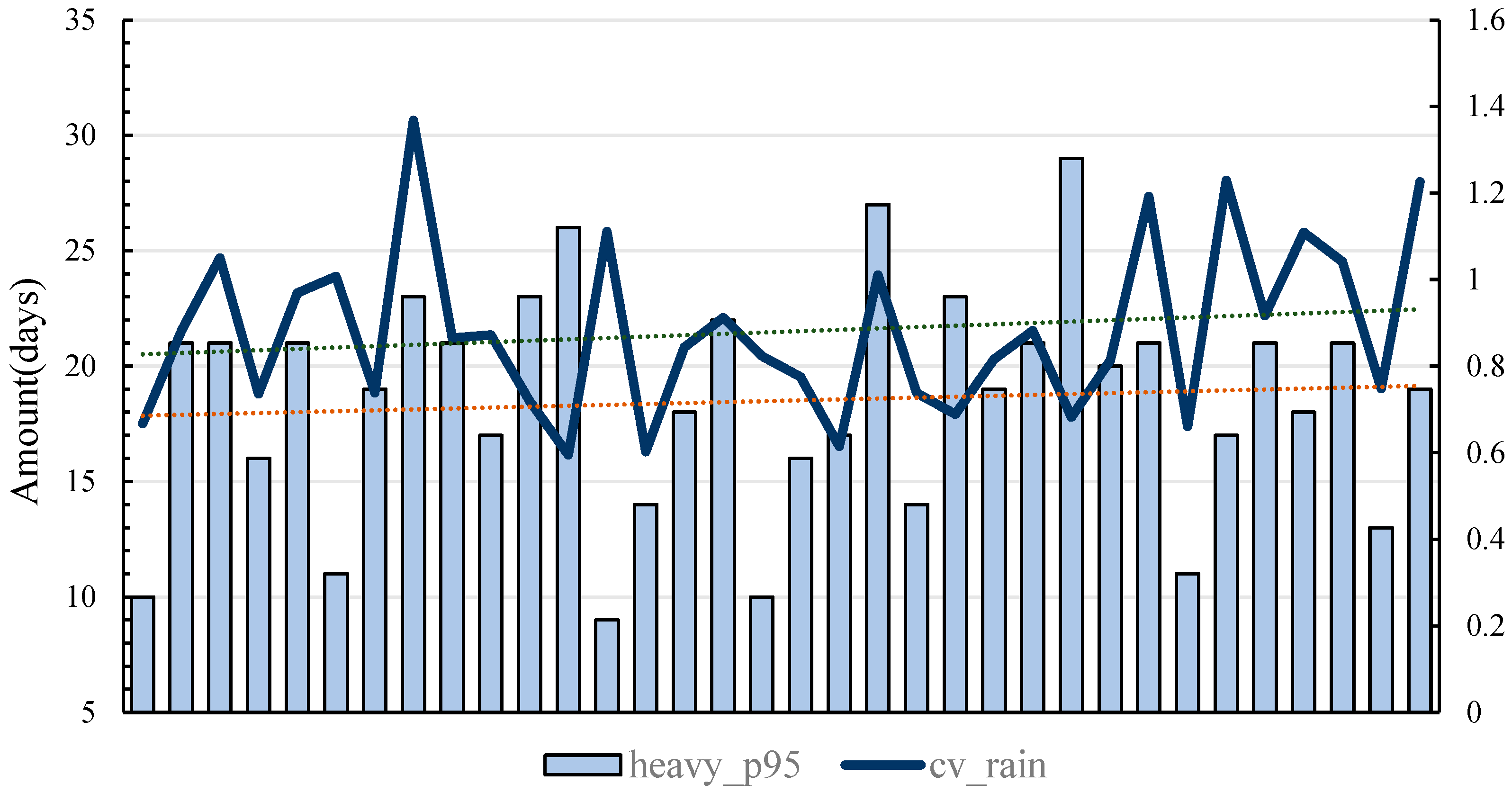 Changing trends of extreme precipitation days and annual rainfall imbalance index in Wuyi Mountain (1990–2024). heavy_p95 represents the number of days with daily precipitation exceeding the 95th percentile threshold, while cv_rain denotes the coefficient of variation of annual daily rainfall. Both indicators are calculated based on daily temperature and precipitation records from the Wuyishan Meteorological Station. The dashed lines show the projected future trend based on current data.