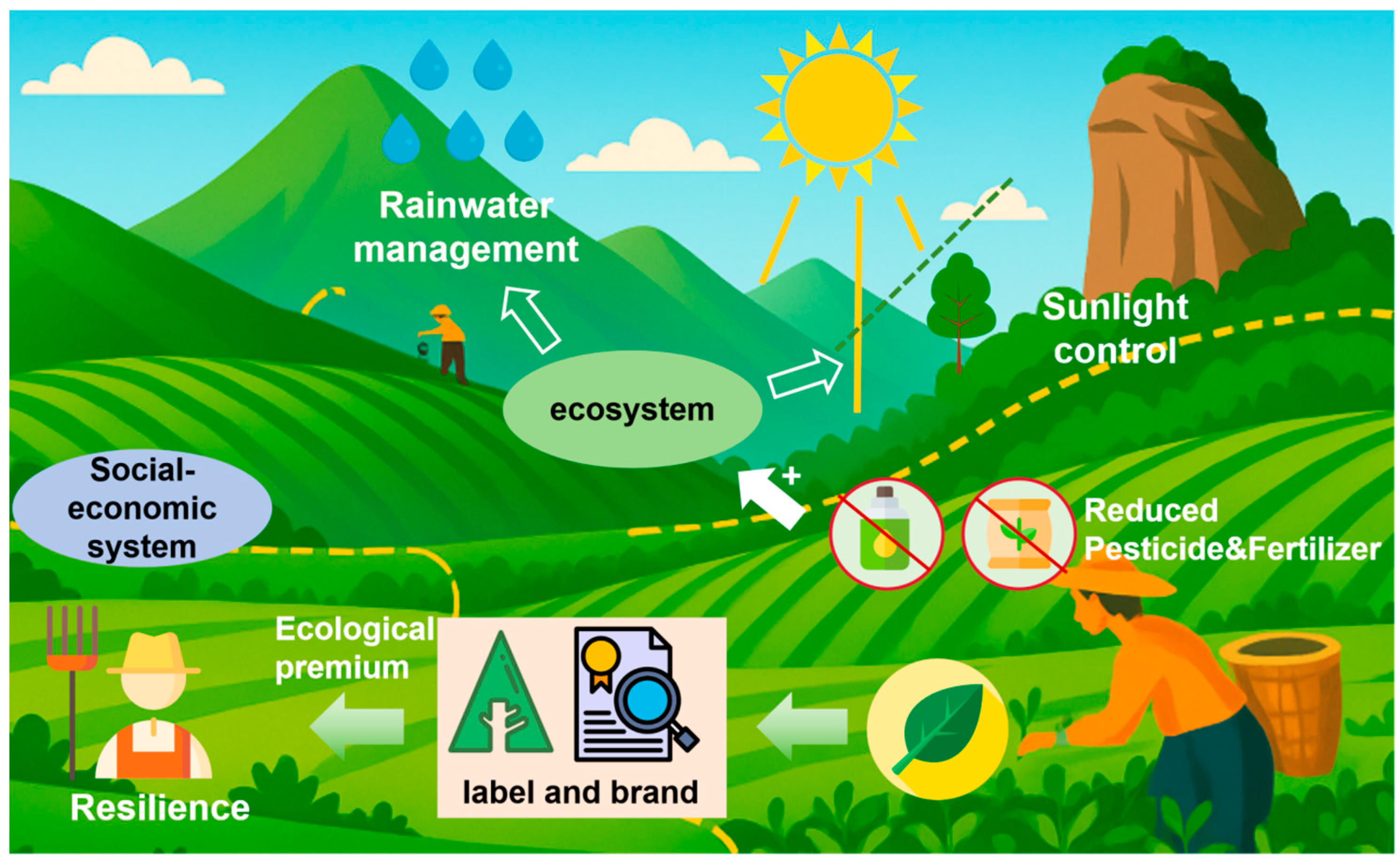 The ecosystem function enhancement pathway operates through EPB practices that strengthen natural climate buffering. Reducing chemical inputs preserves soil microbial communities essential for nutrient cycling and water retention. Biodiversity conservation maintains natural pest control that becomes more valuable under climate stress. Ecological management creates microclimate regulation that stabilizes growing conditions. These ecosystem services function as biological infrastructure providing climate resilience unavailable through technological solutions alone []. The economic value realization pathway operates through market mechanisms rewarding ecological production. EPB enables access to certification schemes, geographical indications, and national park branding that create price premiums—approximately 10% higher per kilogram for ecological tea in Wuyi Mountains []. These premiums provide economic buffers against climate-induced production variability while incentivizing continued ecological practices. The convergence of biophysical and economic benefits creates positive feedback where climate adaptation becomes economically self-reinforcing.