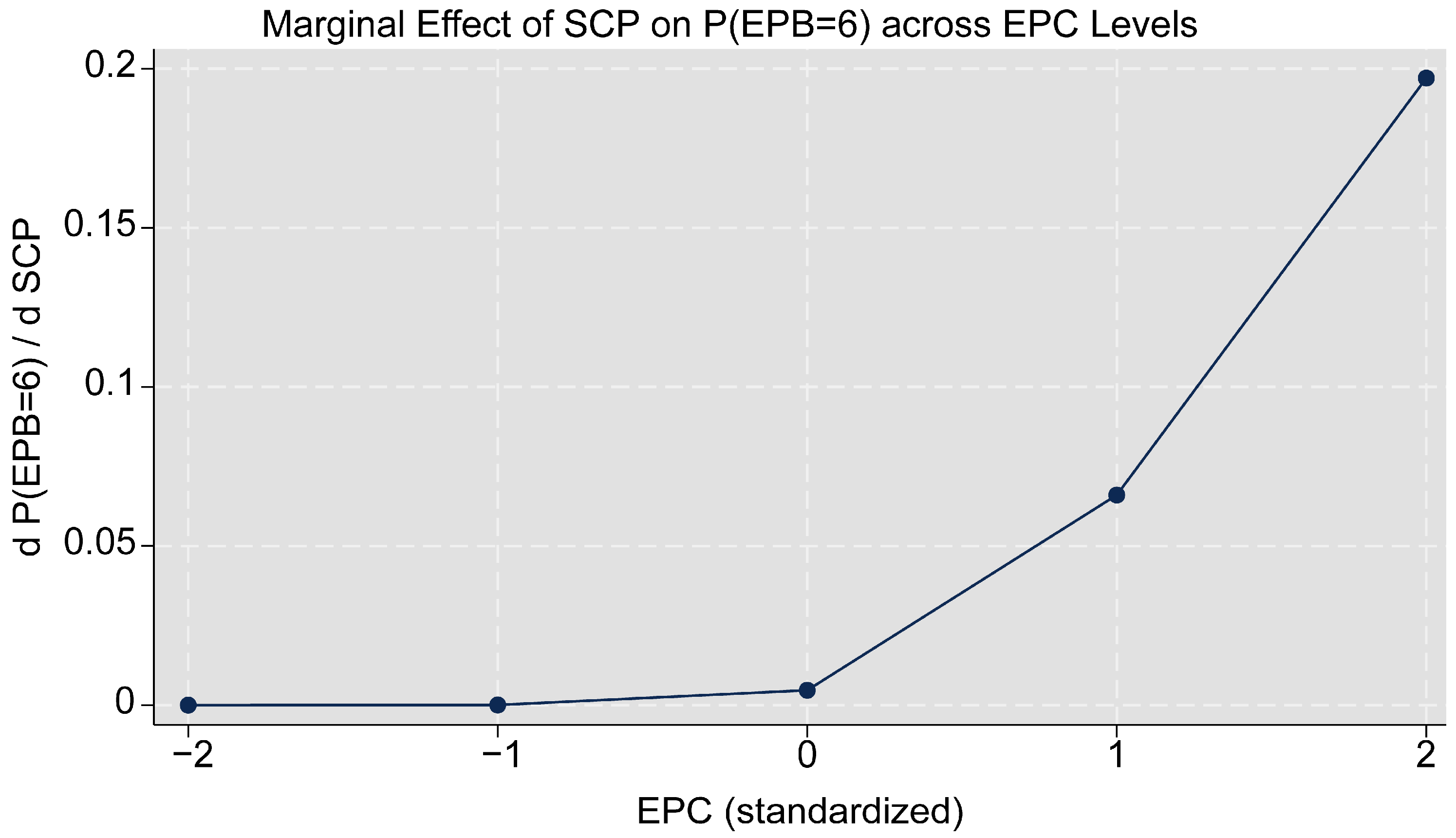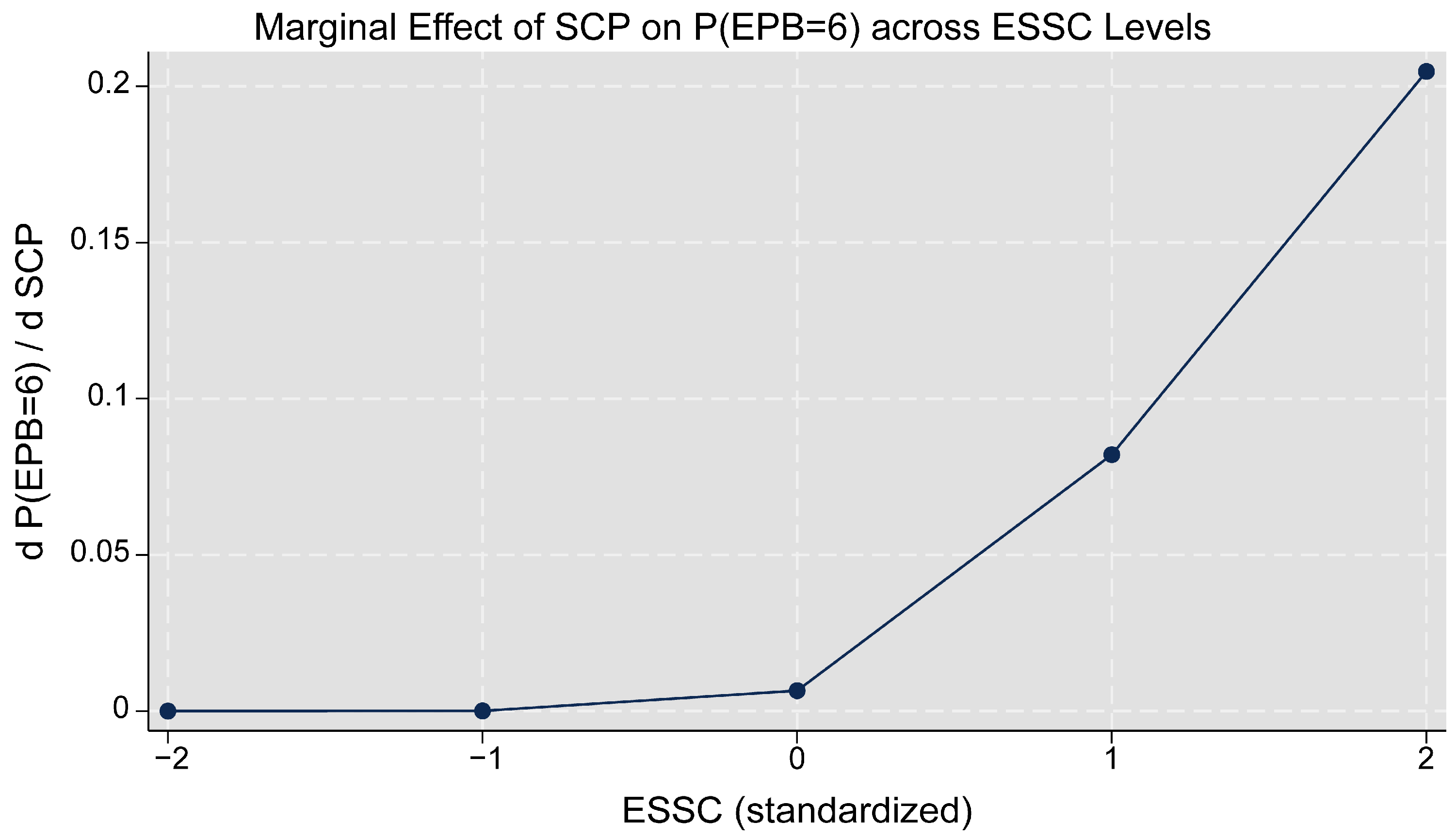 To illustrate the moderation mechanisms more intuitively, Figure A1, Figure A2, Figure A3 and Figure A4 present a set of four marginal-effects plots based on the interaction models. Each panel shows how the marginal effect of SCP or ECP on the probability of being in the highest EPB category (EPB = 6) varies across different levels of EPC and ESSC. The results show consistent patterns across all four combinations. Higher values of EPC and ESSC strengthen the positive influence of both SCP and ECP on high-level ecological adoption.