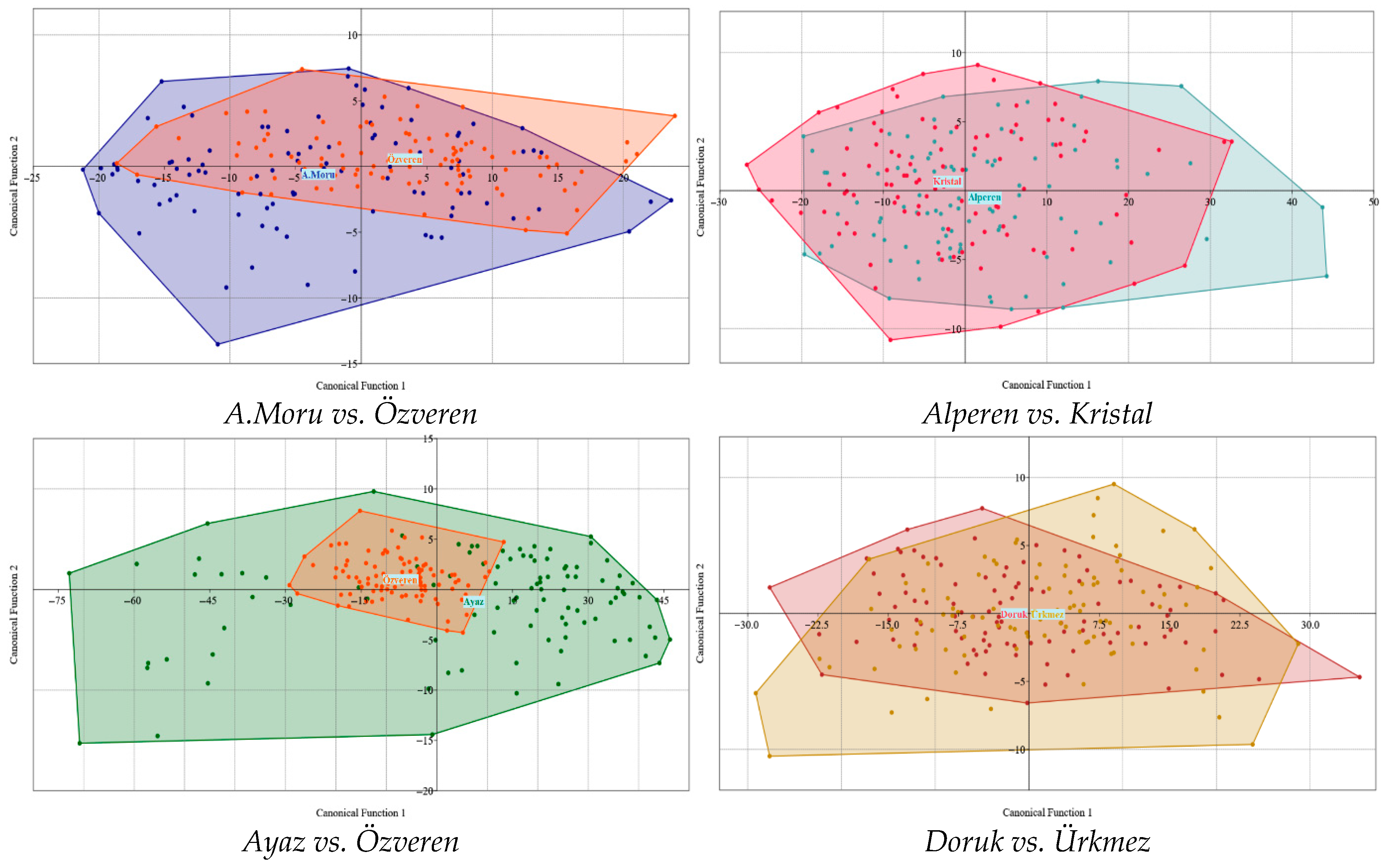 3.3. Linear Discrimination Analysis, Pairwise Comparison, and Multivariate Tests