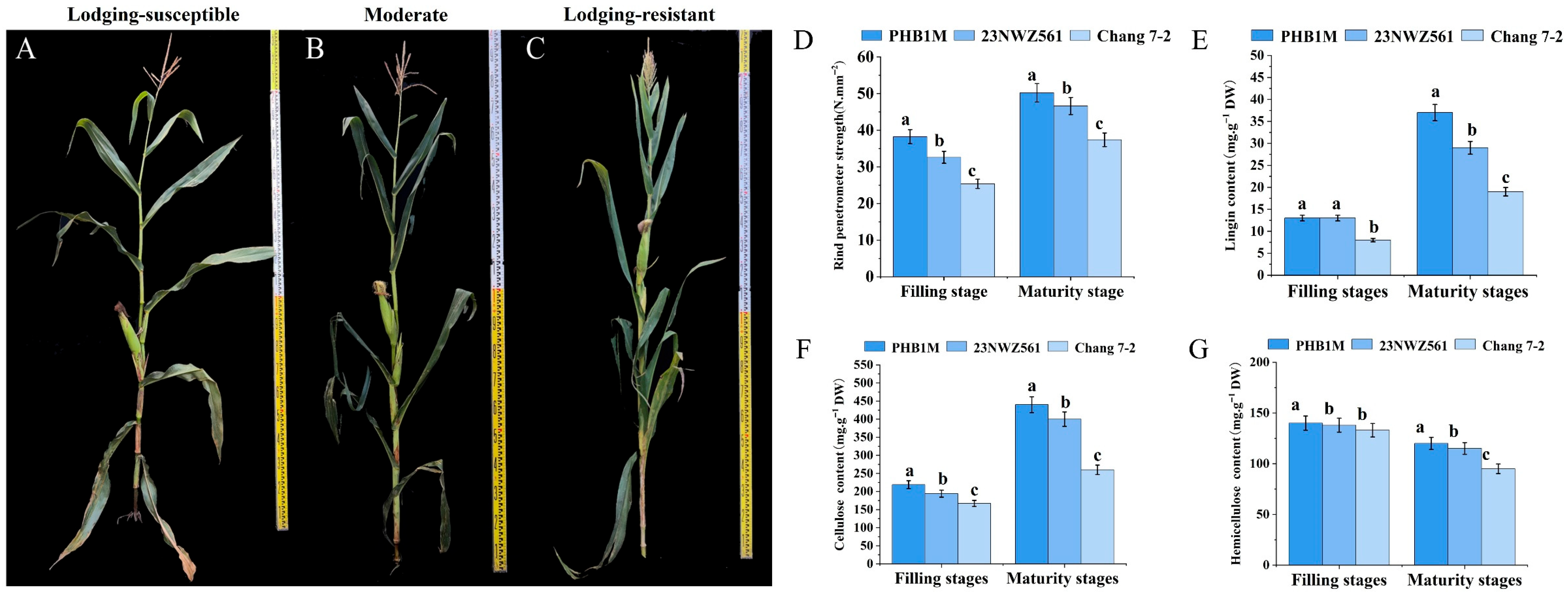 - Yang, J.; Li, M.; Yin, Y.; Liu, Y.; Gan, X.; Mu, X.; Li, H.; Li, J.; Li, H.; Zheng, J.; et al. Spatial accumulation of lignin monomers and cellulose underlying stalk strength in maize. Plant Physiol. Biochem. 2024, 214, 108918. [Google Scholar] [CrossRef] [PubMed]