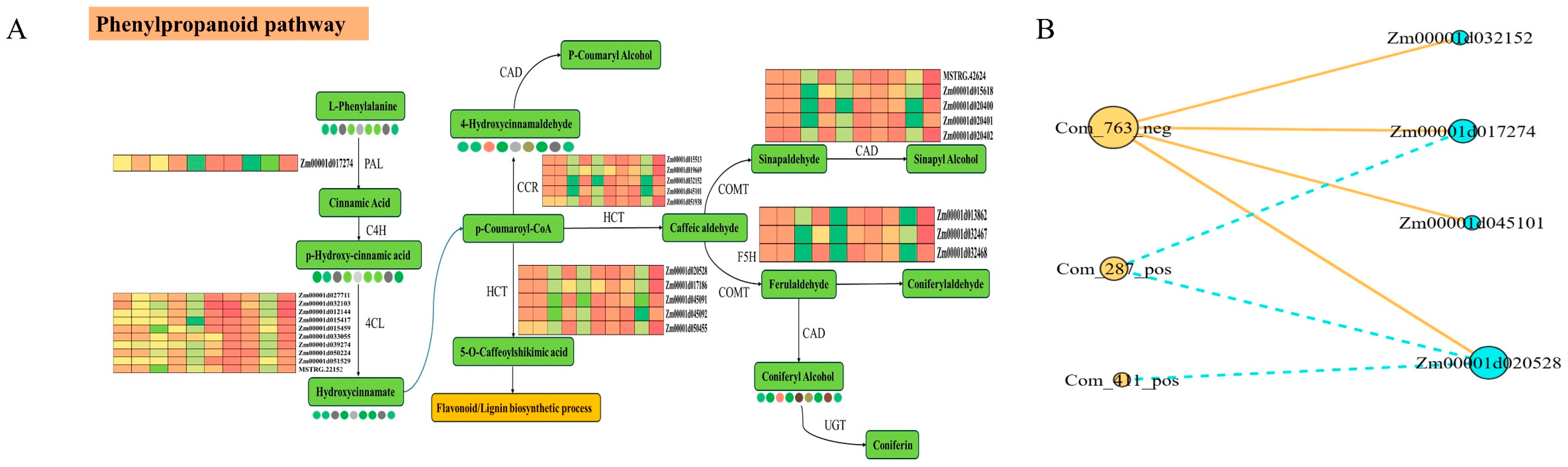 3.5. Integrated Transcriptomic and Metabolomic Analysis Reveals a Core Regulatory Module in the Phenylpropanoid Pathway