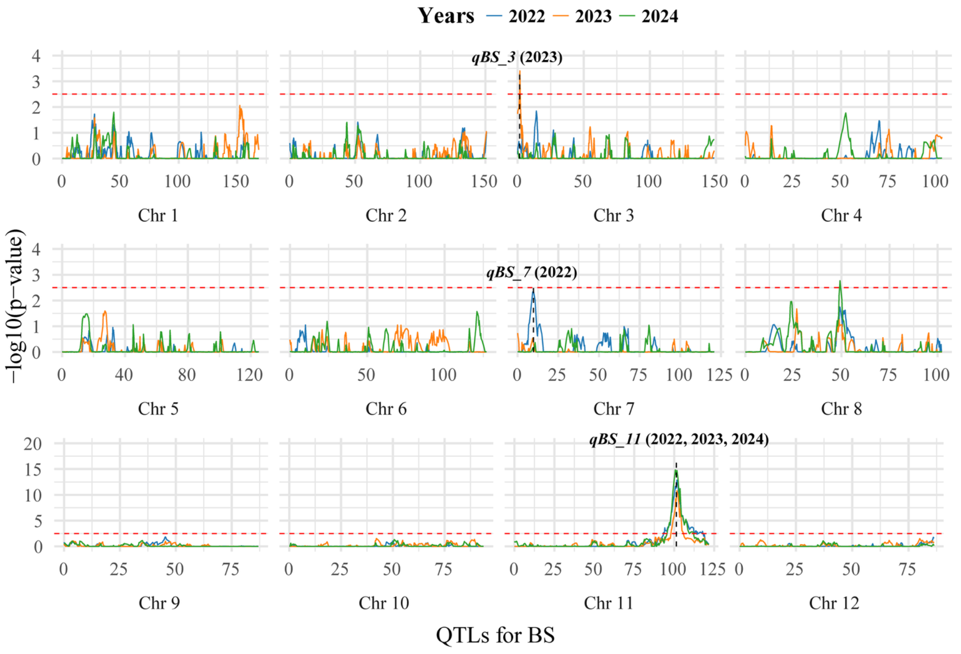 3.6. Candidate Gene Analysis Within the qBS11 Fine-Mapped Interval