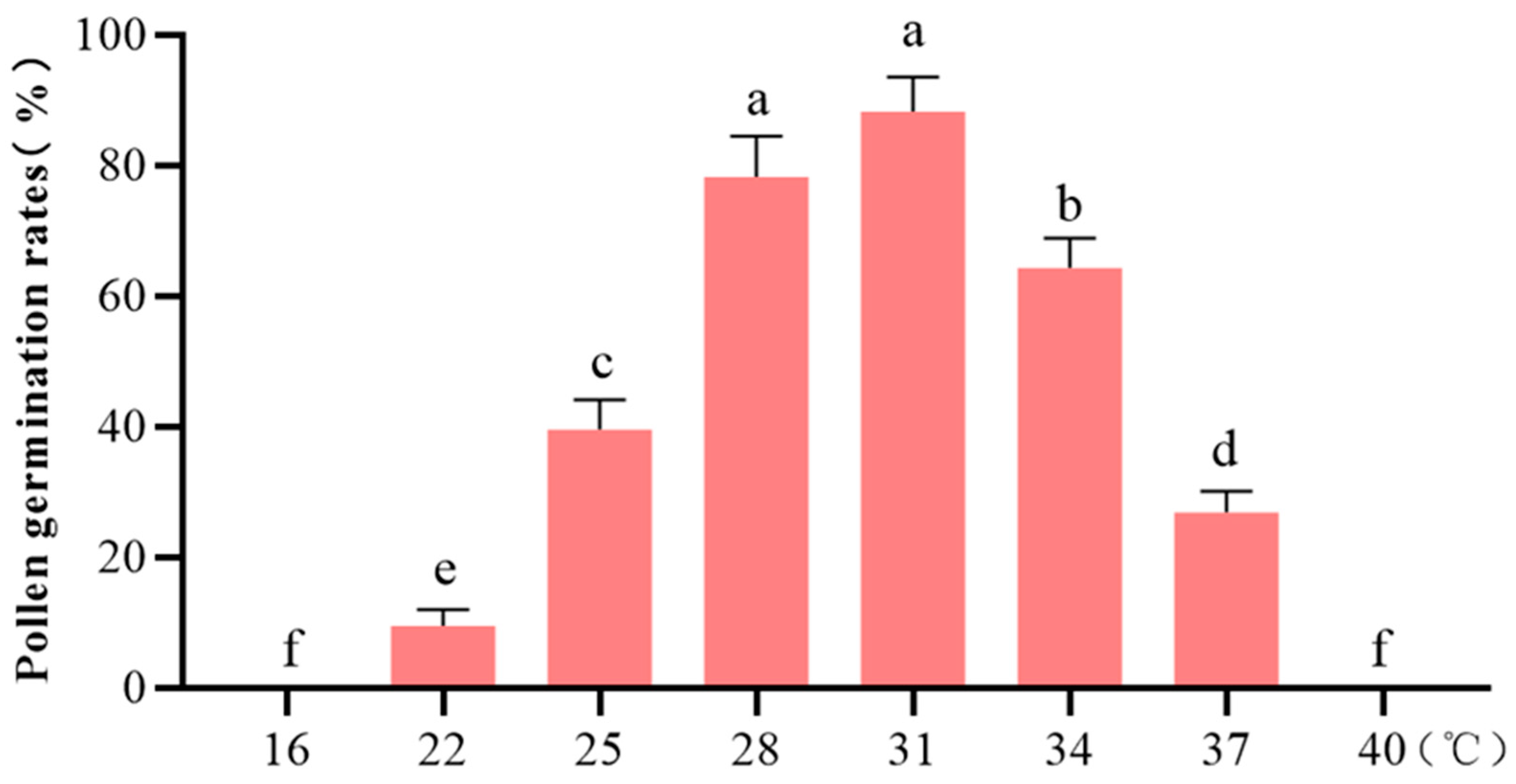 - Kakani, V.G.; Reddy, K.R.; Koti, S.; Wallace, T.P.; Prasad, P.V.V.; Reddy, V.R.; Zhao, D. Differences in in vitro pollen germination and pollen tube growth of cotton cultivars in response to high temperature. Ann. Bot. 2005, 96, 59–67. [Google Scholar] [CrossRef] [PubMed]