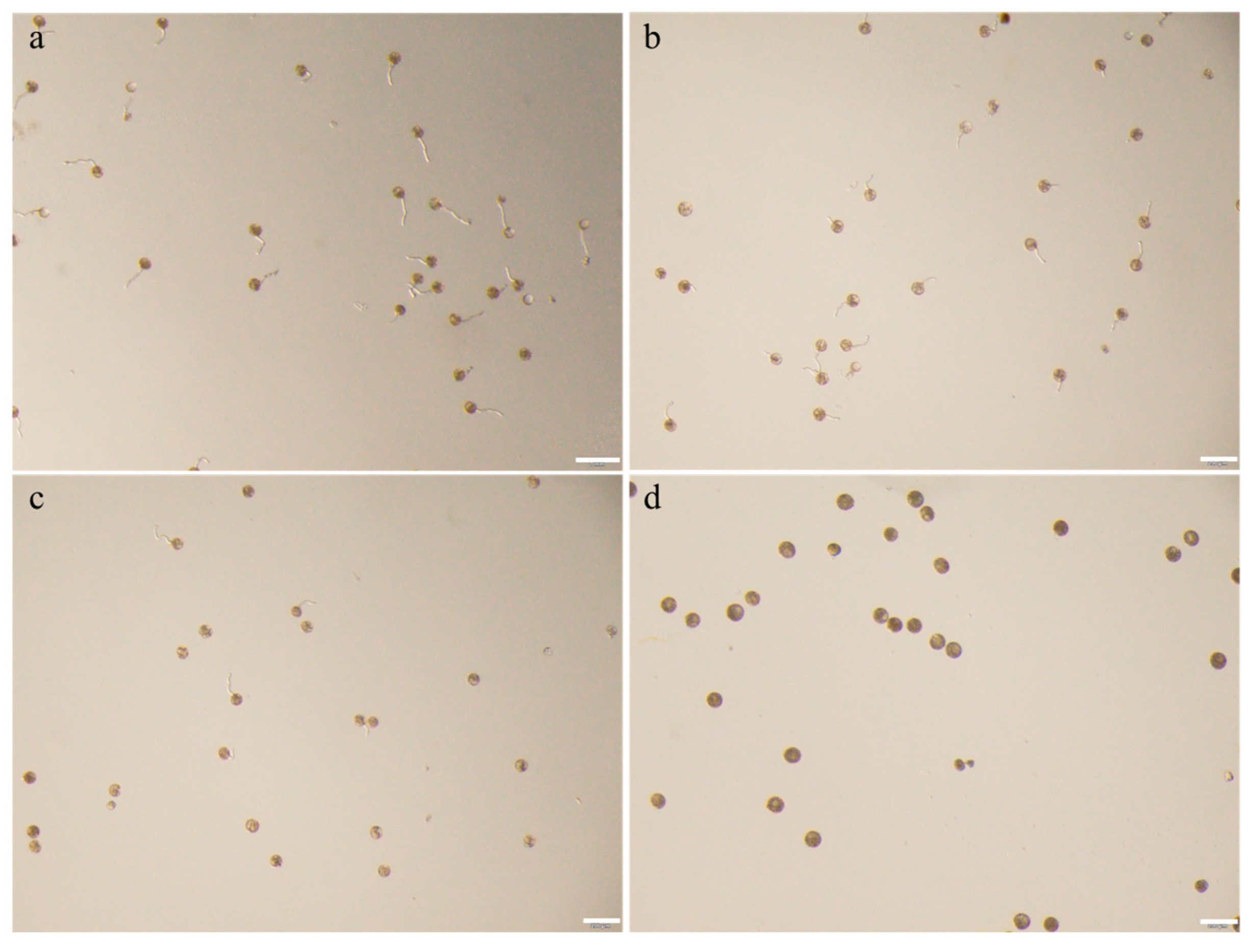 - Tian, C.; Lu, H.; Wang, F.; Zhang, C.Y.; Lin, J.X. Effects of medium components on in vitro pollen germination and pollen tube growth of Picea wilsonii Mast. J. Beijing For. Univ. 2007, 29, 47–52. [Google Scholar]