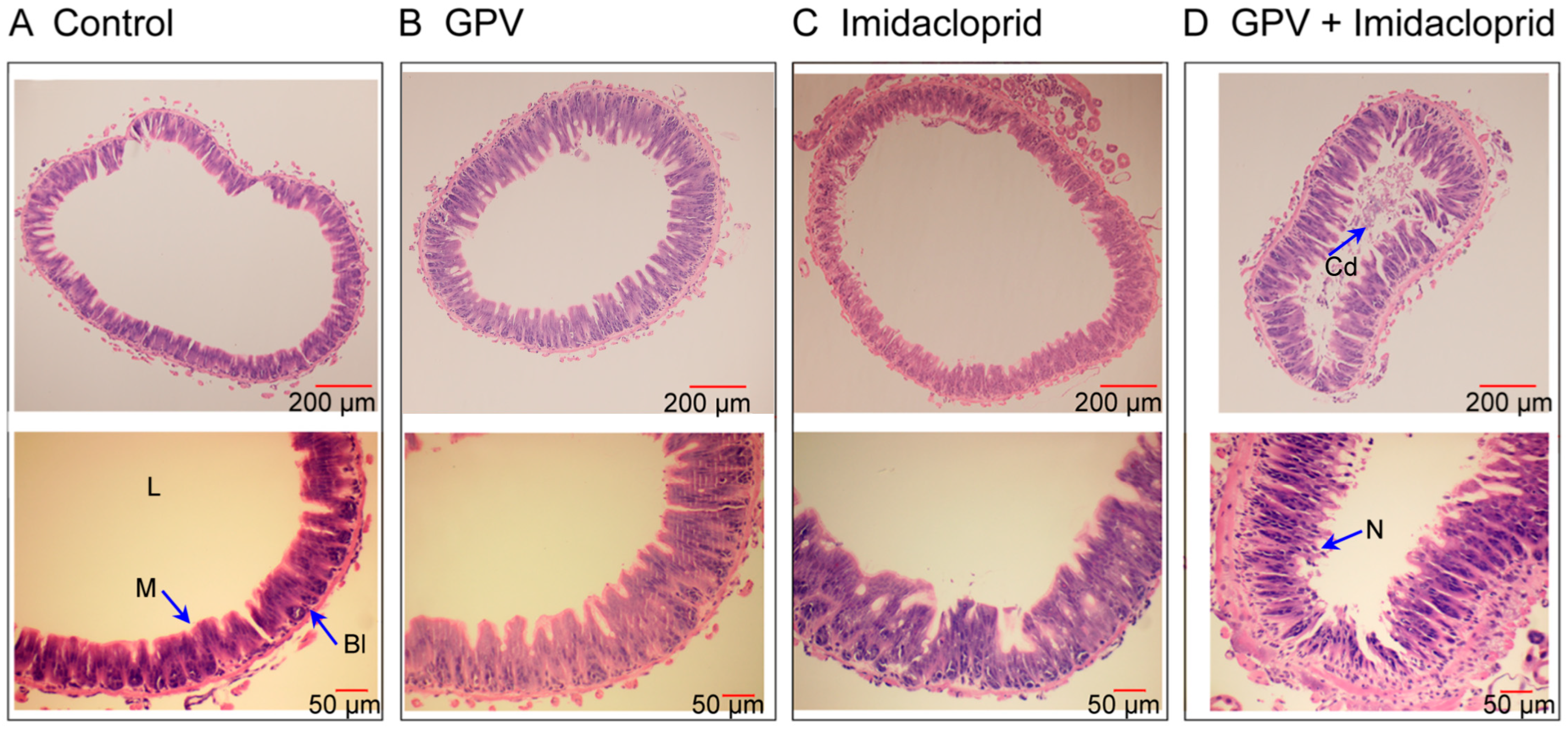 3.2. Combined GPV and Imidacloprid Treatment Induced Synergistic Midgut Epithelial Damage