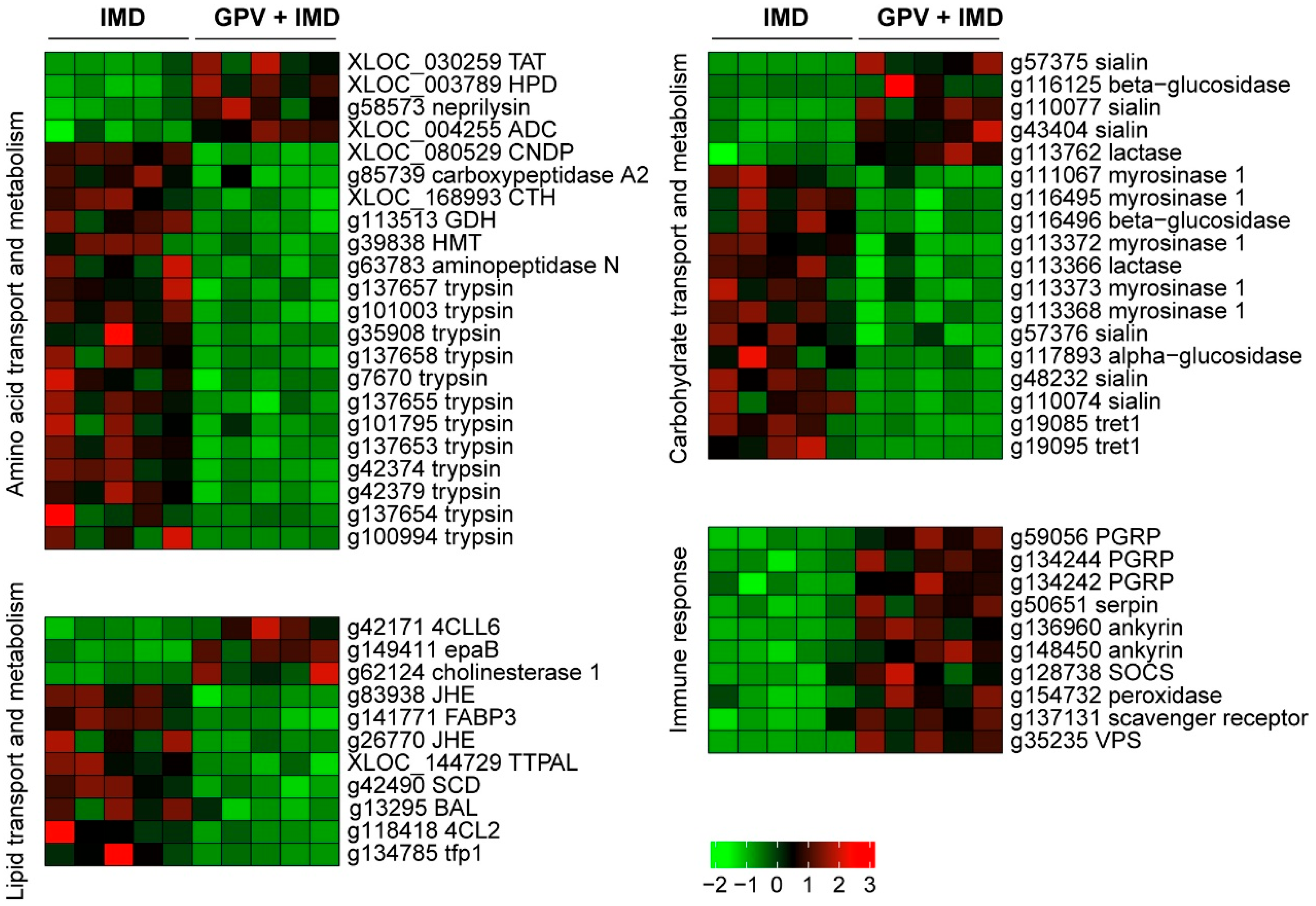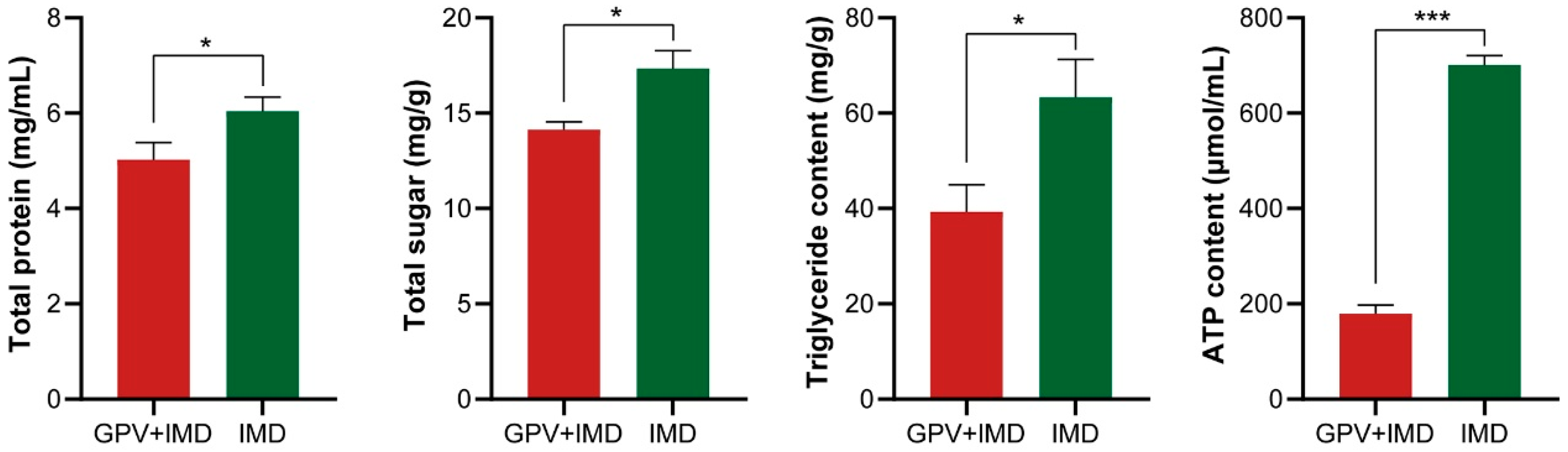 - GPV + imidacloprid: GPV-infected nymphs were incubated for 24 h, then received 2 µL imidacloprid (dissolved in 10 mg/L acetone) on the pronotum.