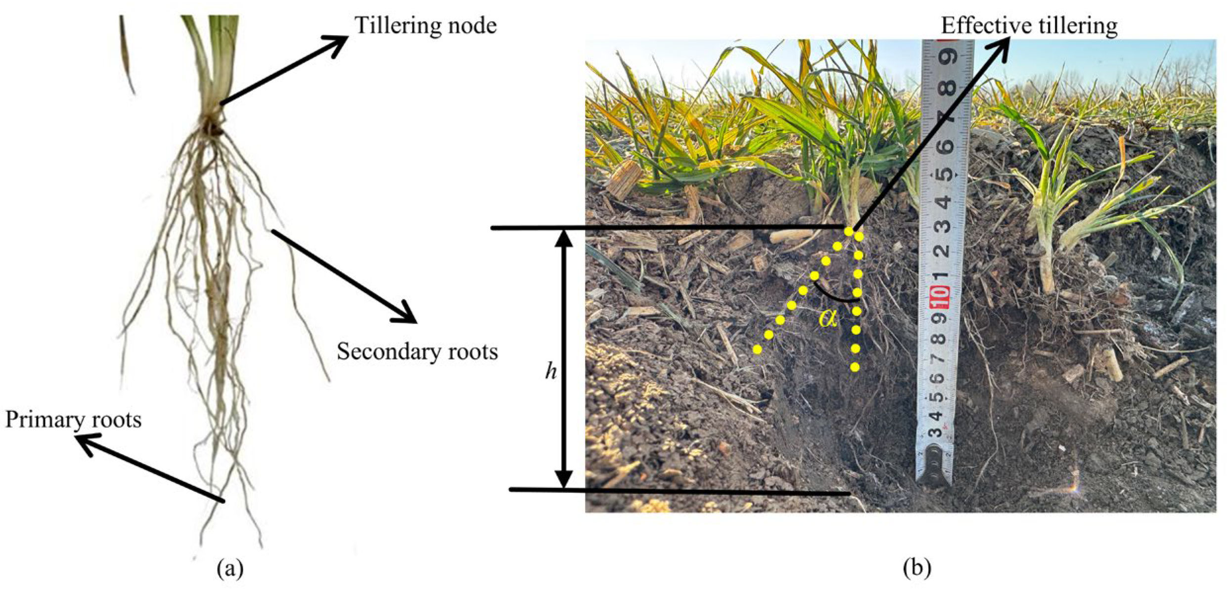 Roots of wheat plant: (a) Wheat root system geometry; (b) Distribution of wheat root systems in the soil. Note: h is the depth of roots in the soil, mm; α is the angle of roots in the soil, °.