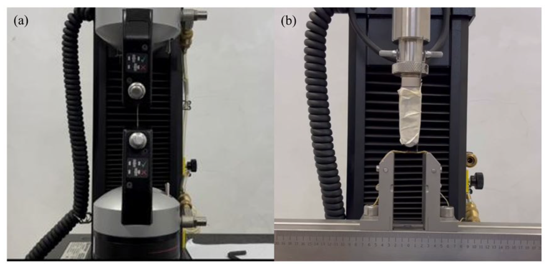 Experimental setups for single-root mechanical tests: (a) Tensile test. (b) Shear test.