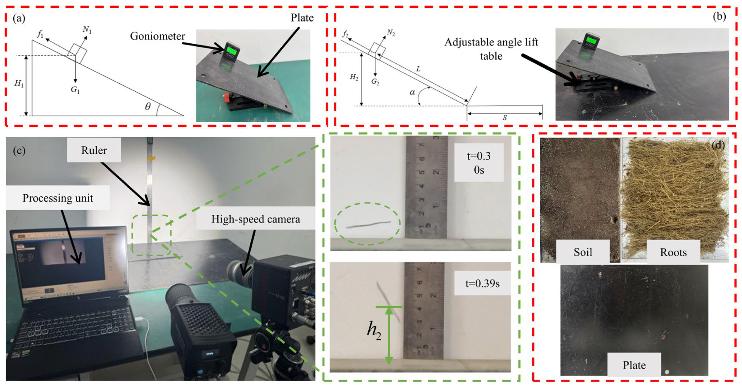 Measurement setups for contact parameters: (a) Test bench for coefficient of static friction, (b) Test bench for coefficient of rolling friction, (c) Test bench for coefficient of restitution, (d) Material plate.