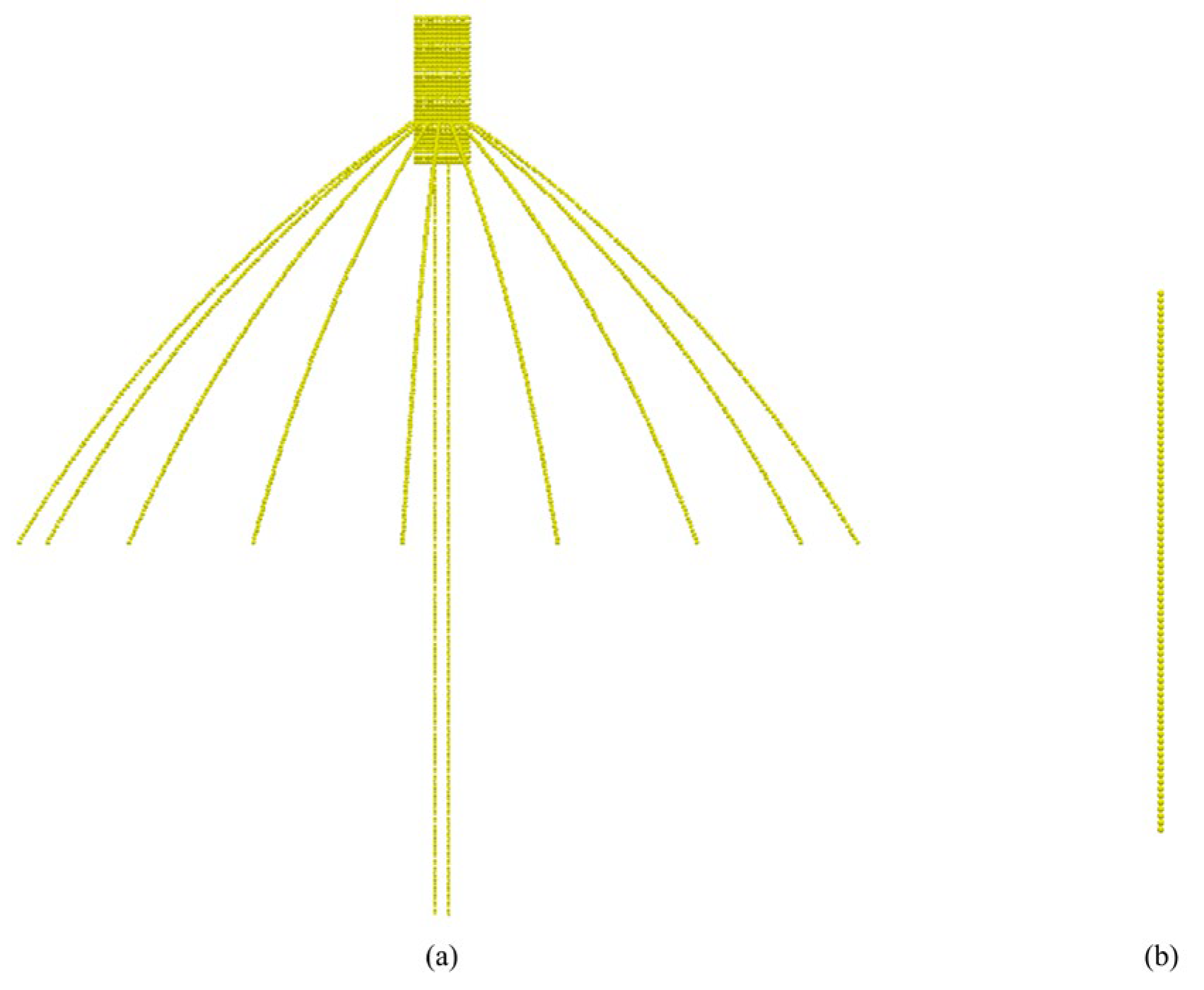 DEM models of the wheat root system: (a) Whole-plant root system model, (b) 150 mm single root model.
