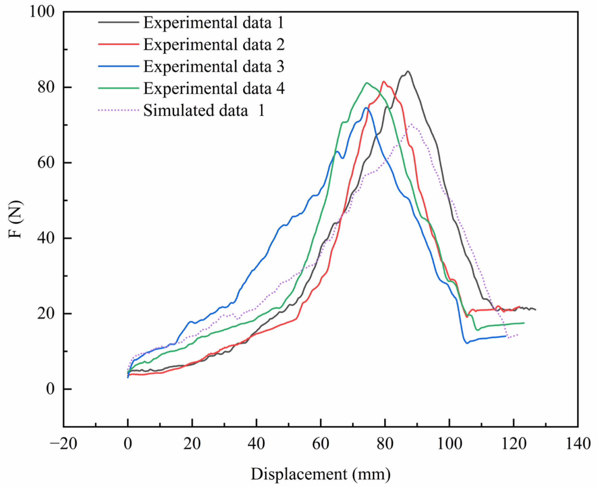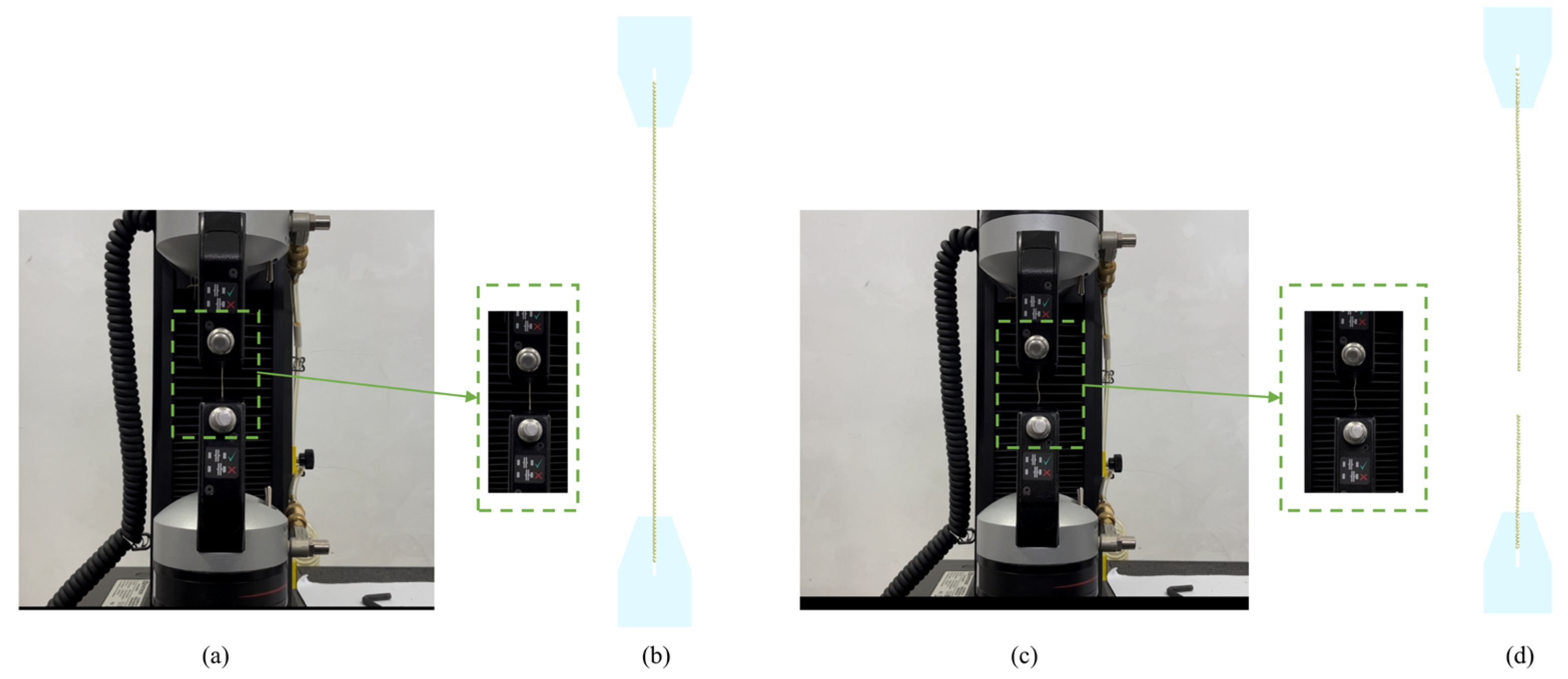 Comparison of experimental and simulated results for single-root tensile behavior, n = 10, units: N: (a) single-root tensioning begins, (b) single-root tension simulation starts, (c) single-root tensile fractures, (d) single-root tensile simulation fractures.