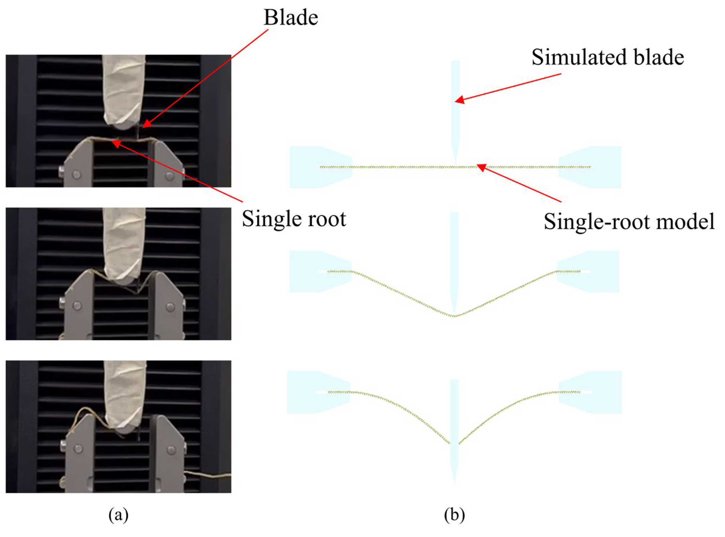 Tensile and shear analysis of a single root through physical and simulation tests: (a) Tensile analysis, (b) Shear analysis.