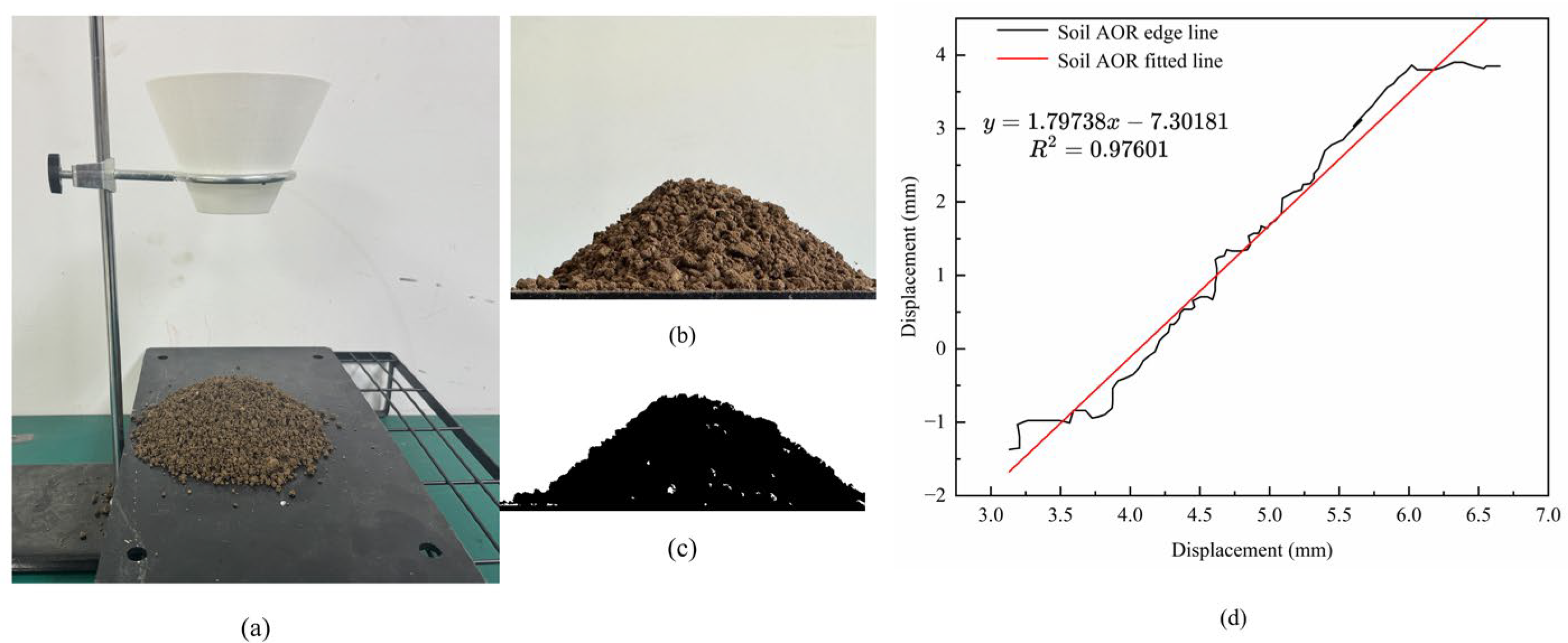 Measurement of soil accumulation angle; n = 10, units: degrees. (a) Measurement of soil accumulation angle. (b) Edge profile of soil accumulation. (c) Binarization of soil accumulation. (d) Edge fitting to determine the angle of repose.