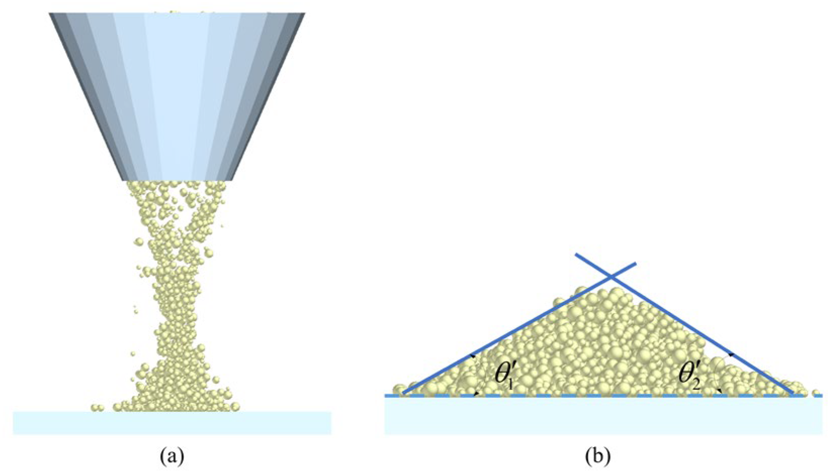 Validation of angle of repose test; n = 10, units: degrees. (a) Experimental angle of repose. (b) Simulated angle of repose.