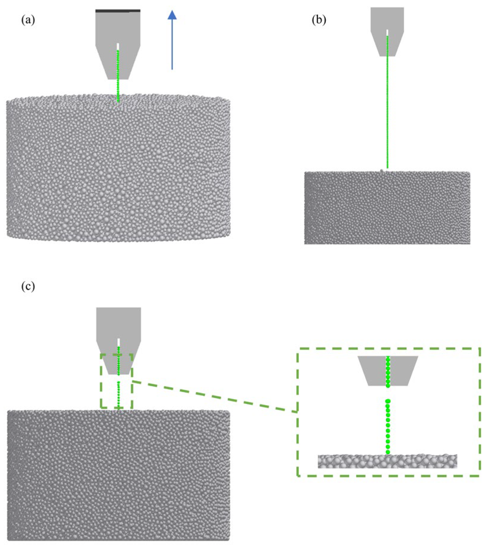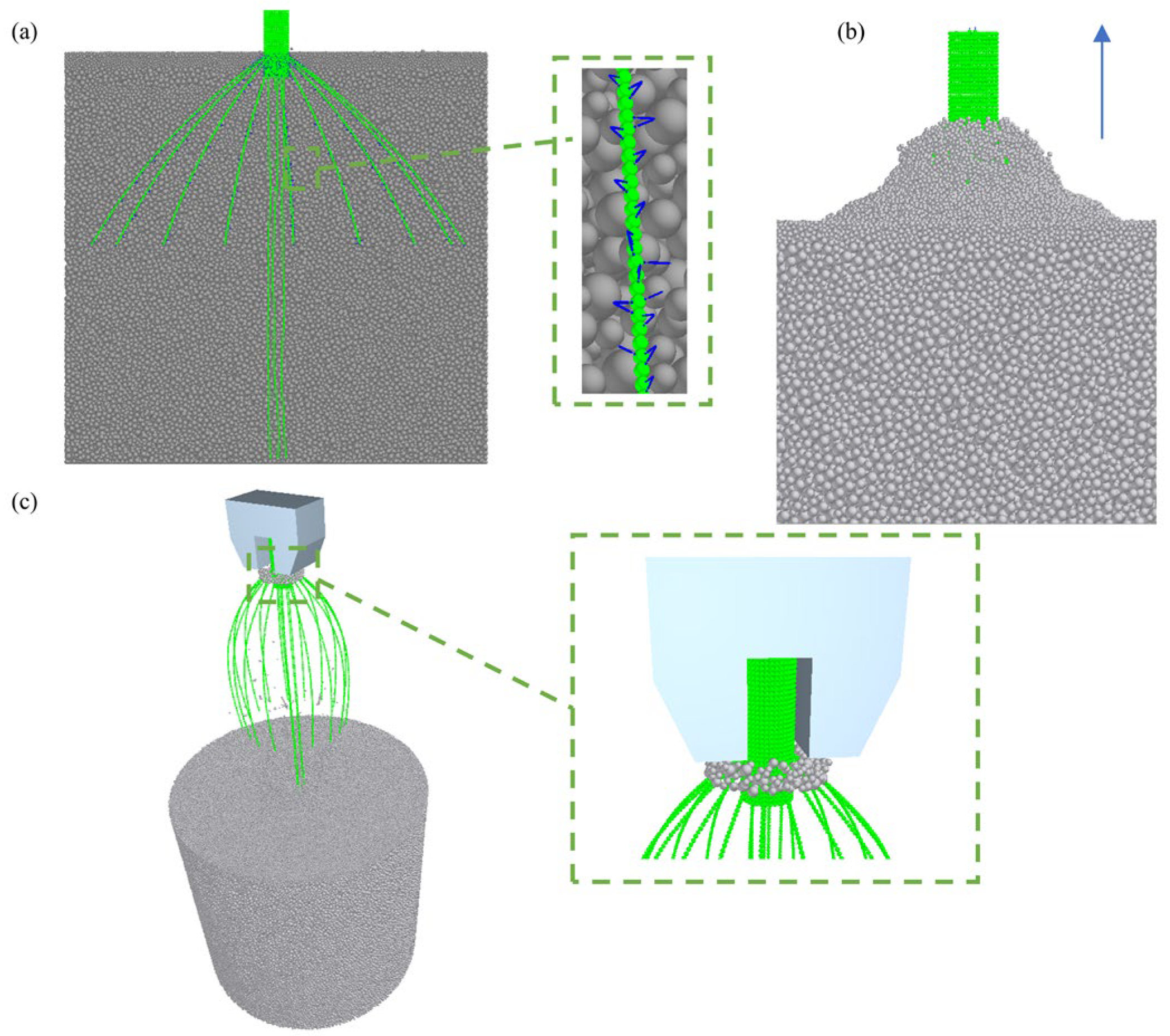Simulation test of pull-out of a single root buried in soil: (a) Initiation of root pull-out, (b) Complete root pull-out, (c) Root pull-out failure. Green: Single wheat root; Blue arrow: Pulling direction; Gray particles: Soil grains; Gray solid: Fixture.