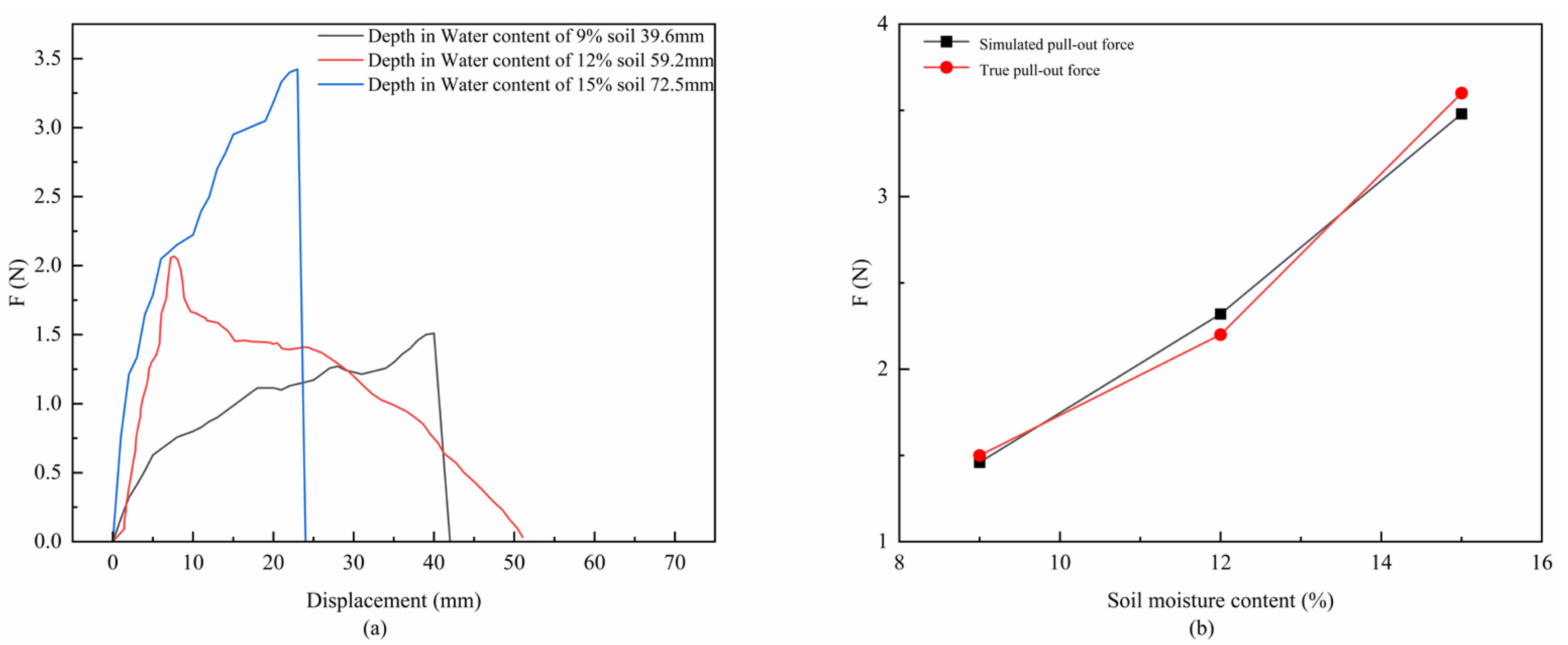 Single root pull-out analysis: (a) Force–displacement curves of actual single root pull-out tests under different soil moisture contents, (b) Comparison of actual and simulated average maximum pull-out force for a single root under different soil water contents.