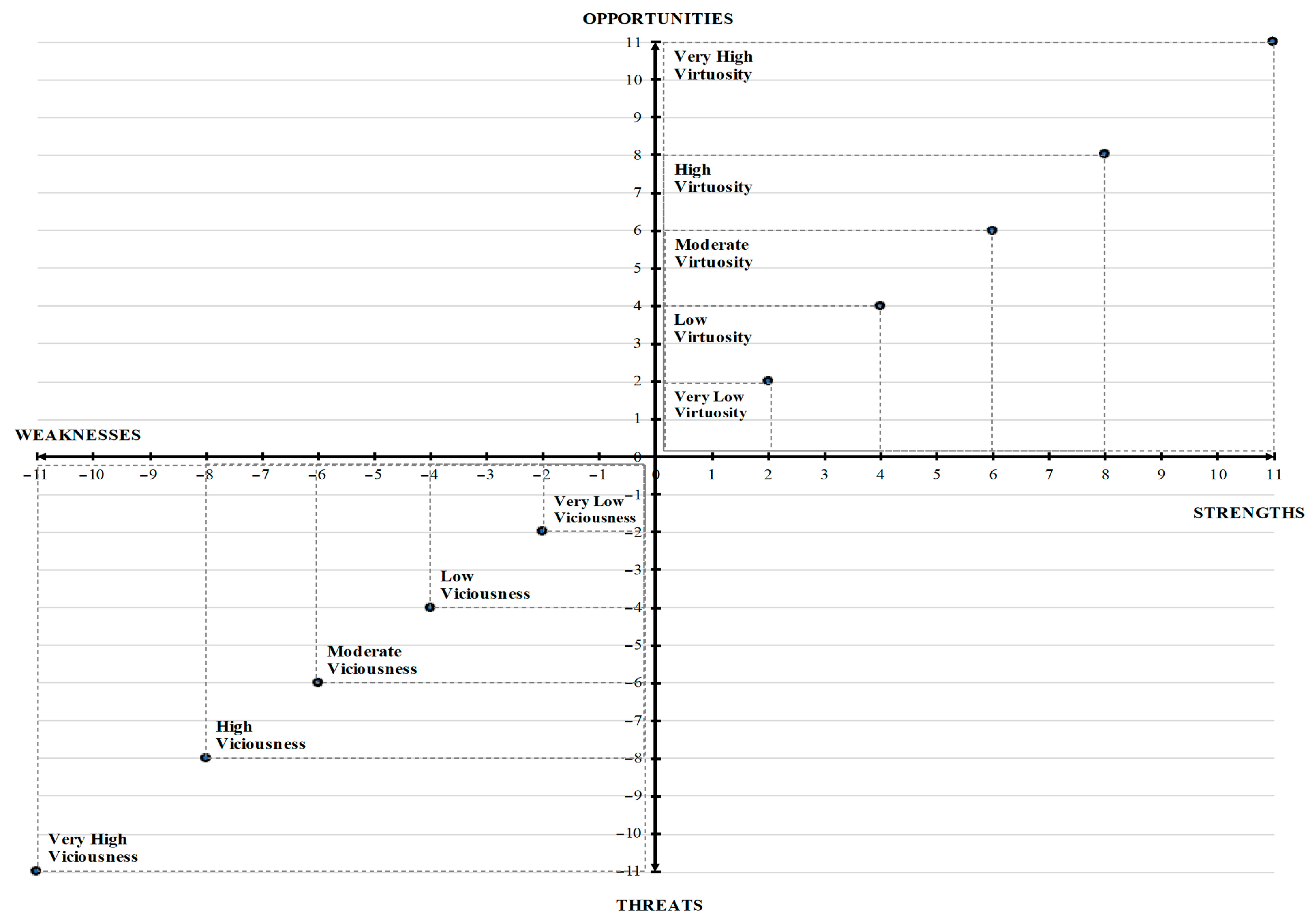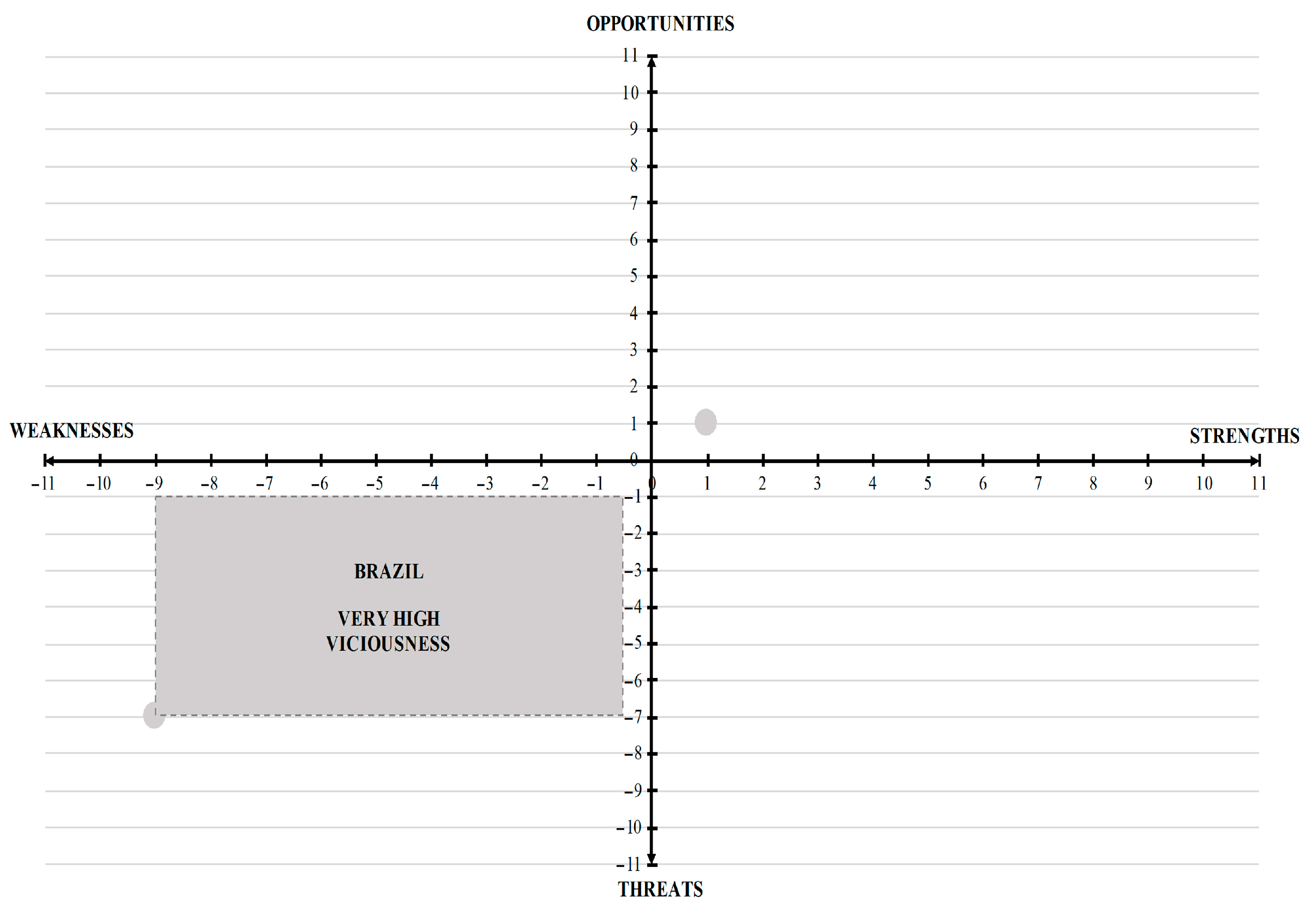 - Vicious Quadrant: Factor 1: Weaknesses (negative X-Axis) versus Factor 2: Threats (negative Y-Axis). This factorial space was determined to be the Vicious Quadrant. To be in this quadrant, the country should receive scores of −1 (minus 1) or 0 (zero) in all determinant variables of the critical factors.