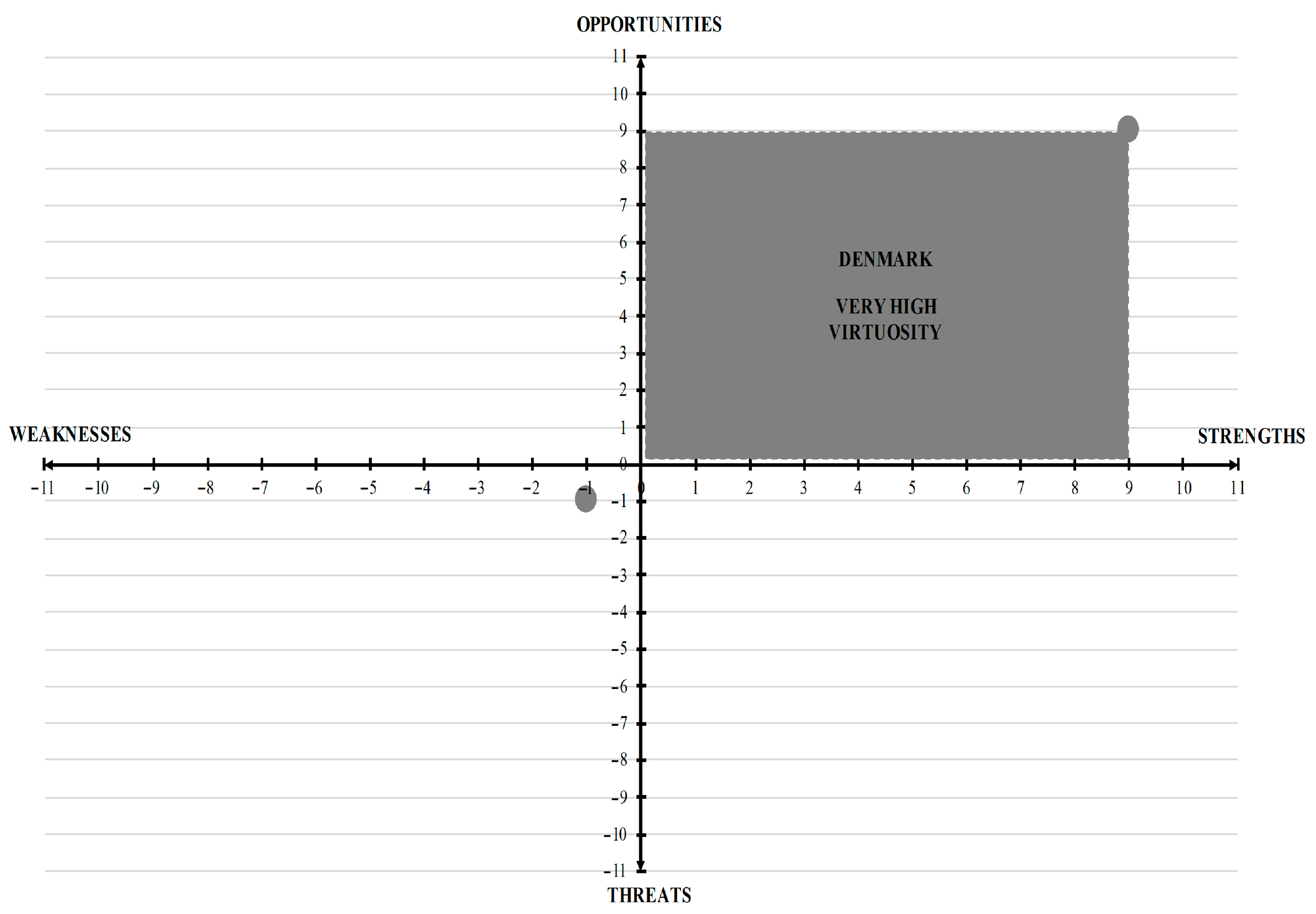 - Virtuous Quadrant: Factor 1: Strengths (positive X-Axis) versus Factor 2: Opportunities (positive Y-Axis). This factorial space was determined as the Virtuous Quadrant. To be in this quadrant, the country should receive scores of +1 (plus 1) or 0 (zero) in all determinant variables of the critical factors.