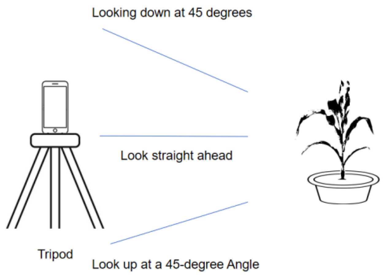 To acquire high quality multi-view RGB images, a vivo S17 Pro smartphone (VIVO, Taiyuan City, Shanxi Province, China) was used as the imaging device and mounted on a tripod to maintain capture stability. Image acquisition was performed around each individual plant at three primary viewpoints: horizontal, 45° overhead, and 45° upward. For each viewpoint, 40 to 50 images were collected, and an additional 5 to 10 top-view images were taken to better capture the structure of the upper leaves. In total, approximately 140 images were obtained for each plant to provide sufficient viewpoint coverage for subsequent three-dimensional reconstruction, as illustrated in