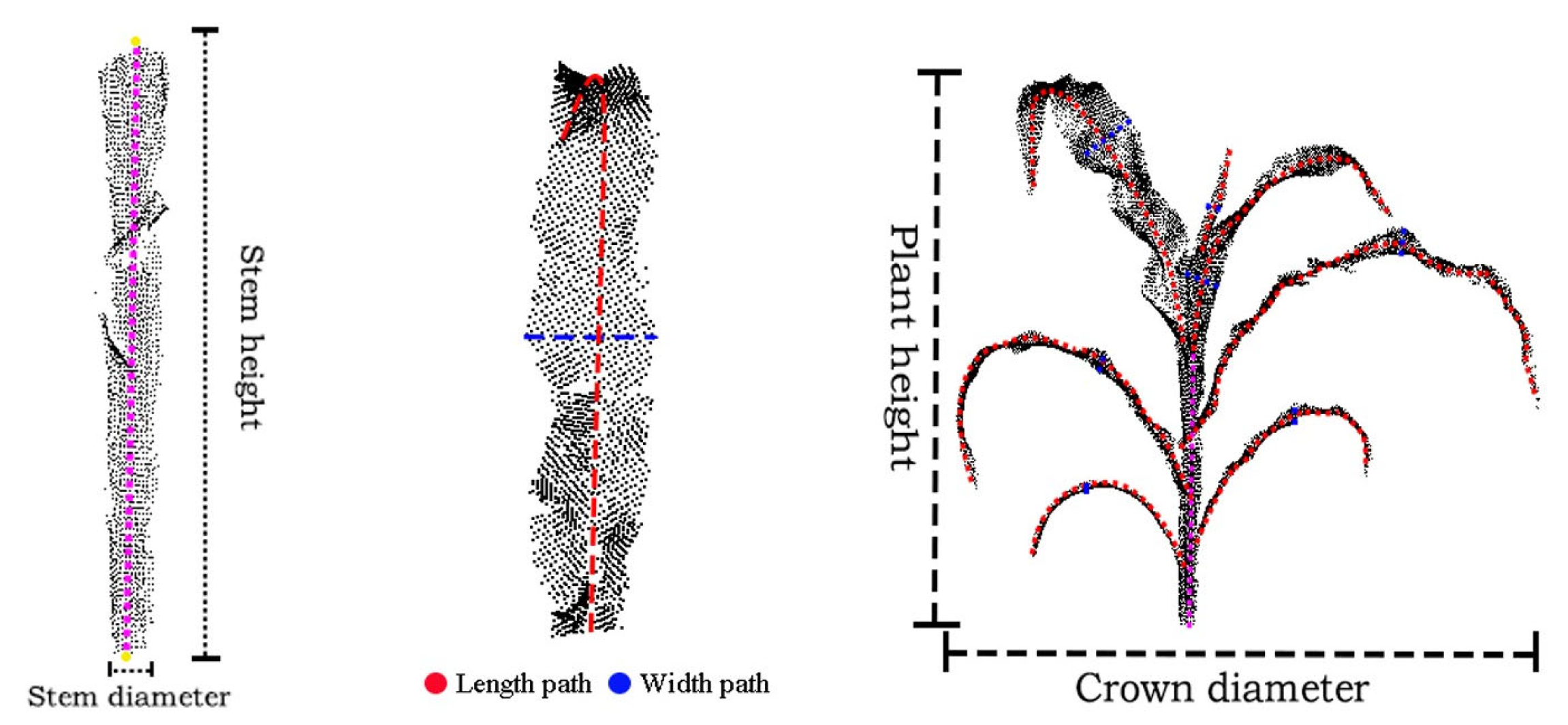 In this study, seven key phenotypic parameters, namely plant height, crown diameter, stem height, stem diameter, leaf length, leaf width and leaf area, were selected for extraction, as they together constitute a multi-dimensional index system for evaluating plant growth and structure. Plant height directly represents the overall vegetative growth vitality, while crown diameter reflects the plant’s space occupation and light competition ability. Stem diameter is a key factor in measuring mechanical support and conduction capacity and predicting lodging resistance, while stem height precisely indicates the elongation of the main stem. As for the leaves, their length and width are the basis for morphological diagnosis, and the estimated leaf area directly quantifies the photosynthetic potential, which is closely related to the final biomass accumulation. Through these parameters, this study aims to decompose the macroscopic three-dimensional structure into quantifiable traits with clear biological functions, providing a solid foundation for high-throughput phenotypic analysis. The phenotypic parameter extraction method is shown in