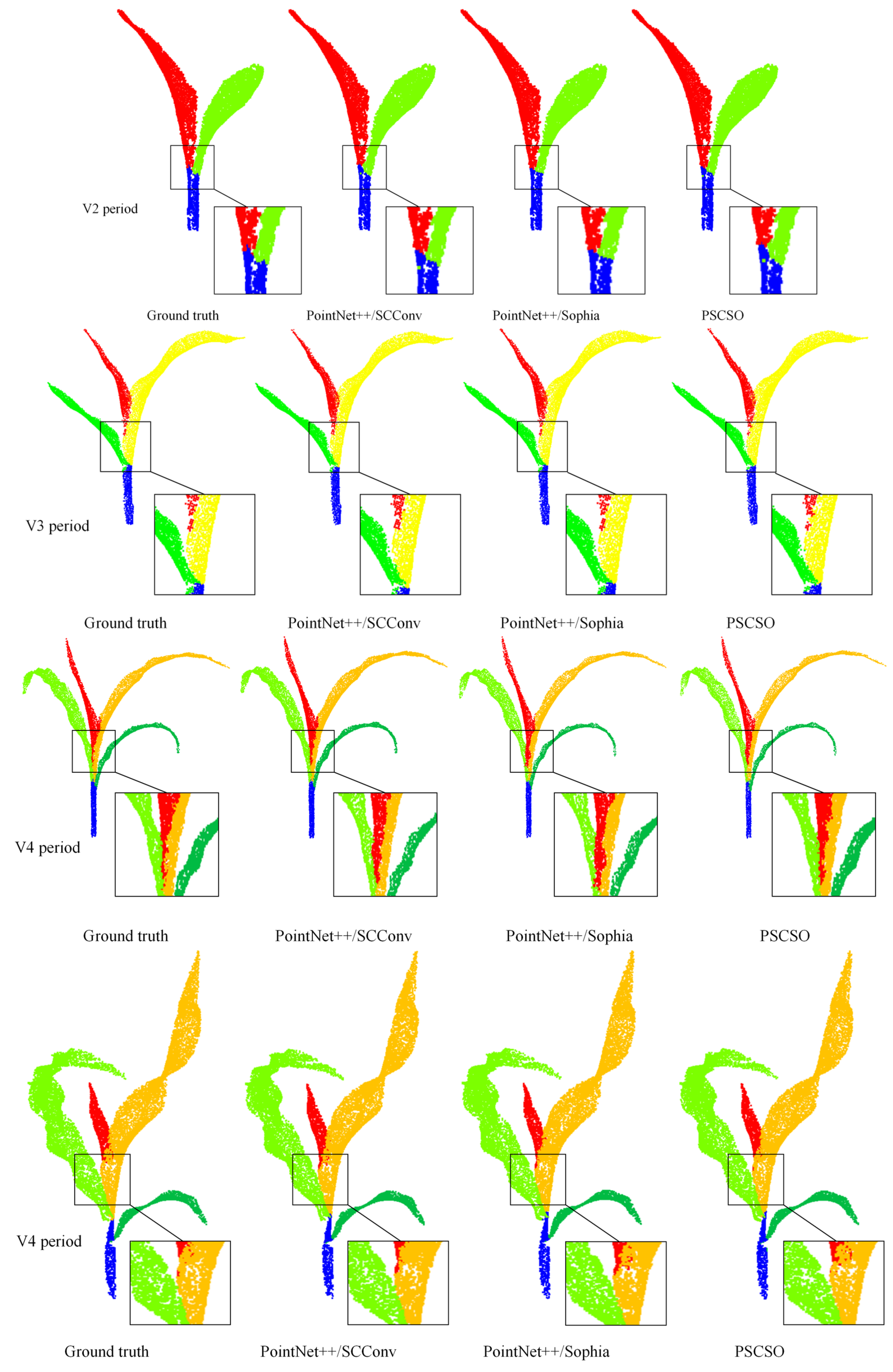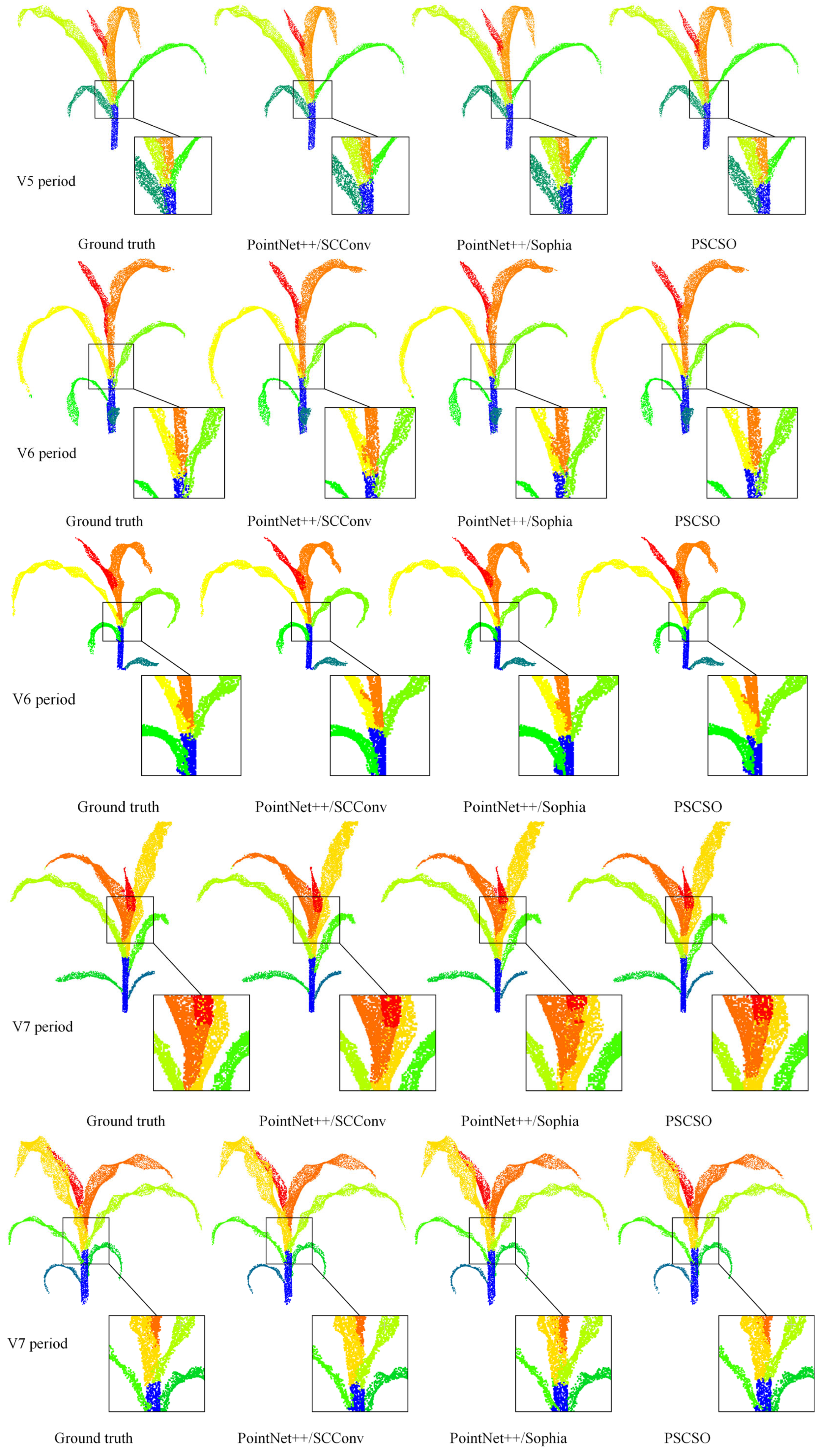 In particular, the exceptional performance of PSCSO in the MIoU metric highlights its strong ability to handle complex plant organ boundaries and overlapping leaf structures. Overall, the PSCSO model exhibits clear advantages in processing plant point cloud data characterized by complex morphological variations, providing a robust and scalable technical solution for 3D plant phenotyping. It holds significant potential for applications in agricultural automation monitoring and high throughput phenotypic analysis.