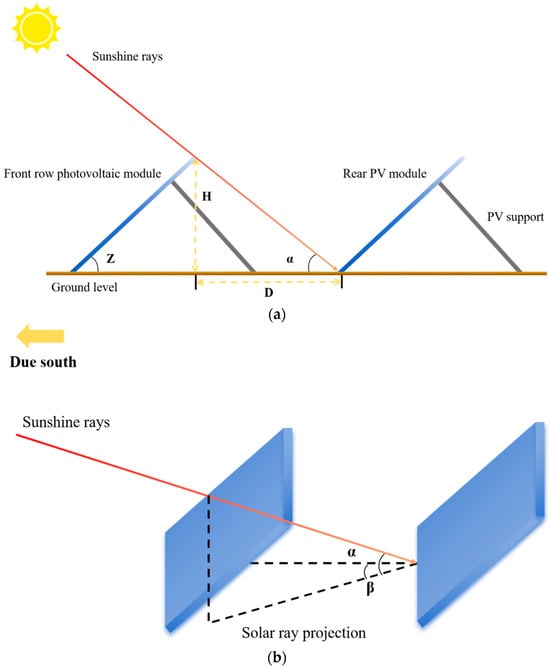 Since the experimental site is located in the Northern Hemisphere, the PV modules were oriented due south (azimuth angle fixed at 0°) to maximize incident solar radiation. Based on this orientation, the modules were mounted at precise inclination angles corresponding to their support frame geometry to ensure optimal solar exposure. When determining the array tilt, sufficient spacing between the front and rear module rows in the north–south direction was maintained to prevent mutual shading. According to the design principle, no shadowing should occur between arrays from 9:00 a.m. to 3:00 p.m. on the winter solstice—the day when the solar altitude is at its annual minimum []. The minimum spacing distance (D) between adjacent PV rows was calculated accordingly, as illustrated in Figure 3.