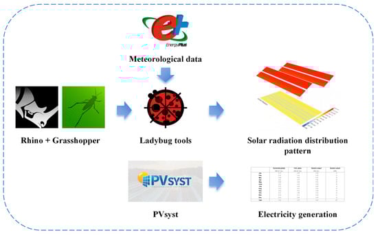 Grasshopper is a parametric modeling plugin for the Rhino platform, enabling geometric generation and logical control through visual node-based programming. It can be deeply integrated with various analytical tools for advanced design and simulation tasks. Ladybug, a Python-based visual analysis tool, supports the analysis and visualization of multiple environmental parameters, including meteorological data, solar paths, radiation intensity, and light distribution. Ladybug conducts light environment analysis by calling the Radiance lighting simulation engine. Radiance employs a Monte Carlo backward ray-tracing algorithm to precisely calculate the propagation, reflection, scattering, and absorption of light in space. It is widely used in building daylighting, solar access analysis, and indoor/outdoor light environment studies, and has become one of the internationally recognized standard tools for architectural light environment simulation [,].