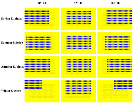 The shadow distribution of PV modules was simulated at three representative times—morning (08:00), noon (12:00), and late afternoon (16:00)—on the spring equinox, summer solstice, autumn equinox, and winter solstice of a typical year. As shown in Figure 6, during the spring, shadows were primarily concentrated in the inter-row areas of the PV array, while the area directly beneath the first southern row of PV modules remains largely unobstructed throughout the day, forming a distinct striped pattern. At 08:00, due to low-angle sunlight from the east, shadows extend approximately 9 m from the eastern edge of the array. At noon, shadows fully cover the interior of the array, reaching their maximum coverage for the day. By 16:00, they gradually shift eastward. Within these striped shadow zones, alternating blue (shaded) and yellow (unshaded) areas create a regularly spaced pattern. During the summer solstice, the solar altitude reached its annual maximum, significantly shortening PV module shadows and reducing shadowed areas. The areas directly beneath the modules remain shaded for most of the day, but north–south variation is minimal. In contrast, the inter-row areas receive ample sunlight, showing a marked improvement in light distribution compared with winter and spring.