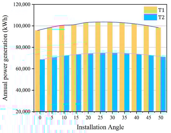 Given that the number of PV modules was identical in the T2, T3, and T4 layouts, the annual energy yield was simulated only for the T2 layout. As shown in Figure 10, the annual energy generation for both T1 and T2 followed a similar trend: it increased with the tilt angle, peaked at around 30°, and then gradually declined. The maximum annual energy output of T2 reaches 103,658 kWh at the optimal tilt angle of 30°. In the 20–30° range, the variation in energy yield remains below 0.5%, indicating that tilt angle had a marginal impact on system performance across different layouts. Compared with T1, the T2 layout has fewer PV modules, resulting in lower absolute energy yields at all tilt angles. However, the relative gain curve of T2 closely aligns with that of T1, with an approximately 8% increase in energy yield from 0° to 25°. At a 25° tilt, the annual energy generation reaches 74,826 kWh, and the rate of decline beyond 35° is consistent with T1, indicating similar sensitivity to tilt angle.