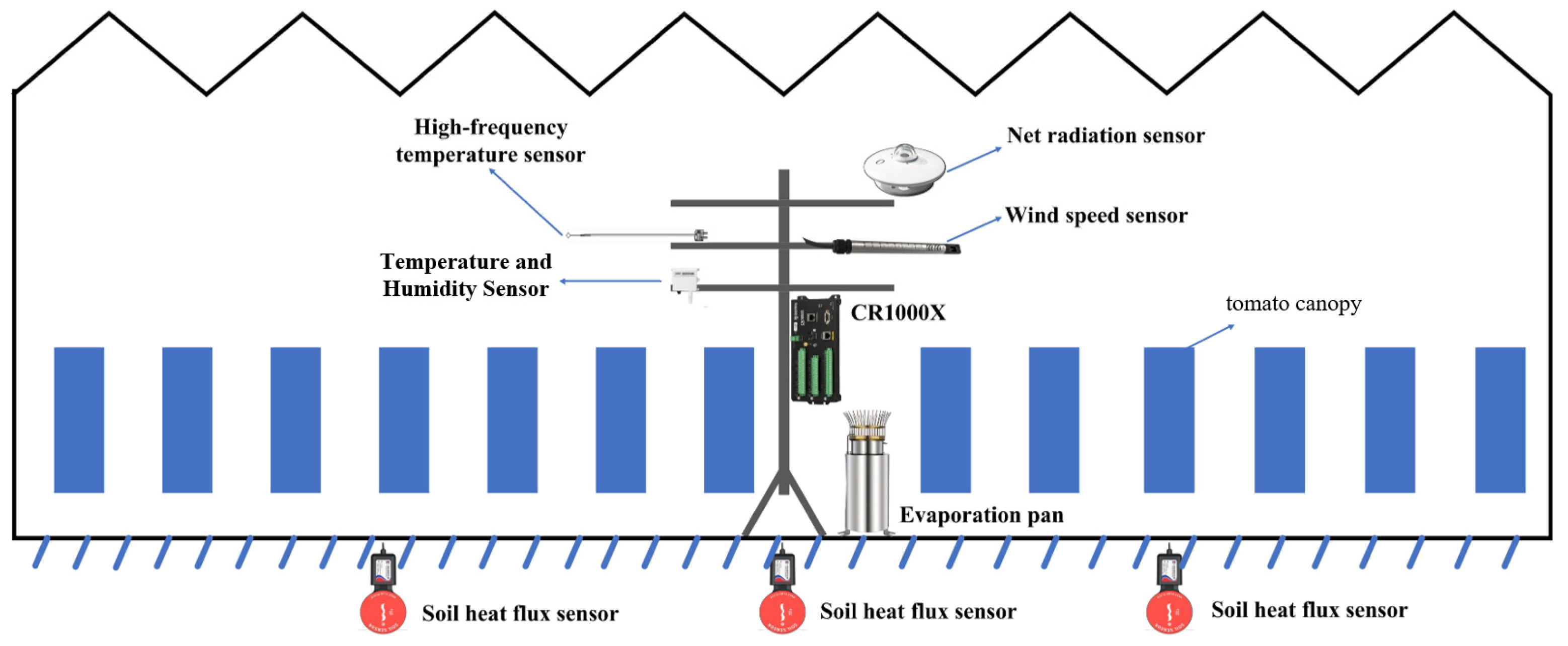 - Gong, X.W.; Li, Y.; Ge, J.K.; Liu, H.; Li, H.H.; Qiang, X.W.; Zhang, L. Calculation Model of Reference Crop Evapotranspiration in Greenhouse Based on Outdoor Meteorological Data during Ventilation. Trans. Chin. Soc. Agric. Mach. 2025, 56, 649–659. [Google Scholar] [CrossRef]