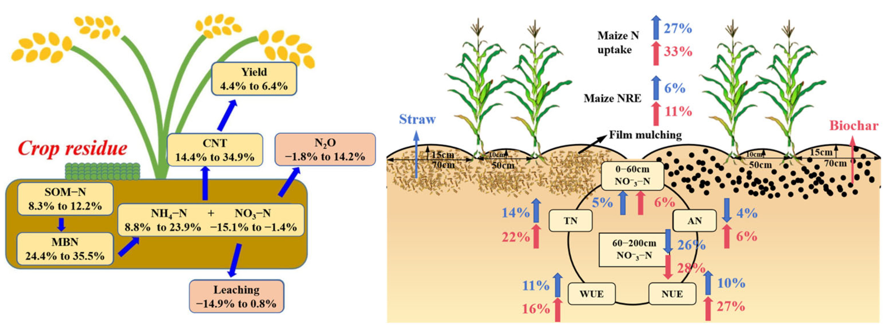 - Wang, Y.; Zhang, M.; Tian, Z.; Yang, J.; Pang, J.; Fang, Y.; Liu, E.; Cai, T.; Ren, X.; Jia, Z. Incorporating straw-derived biochars enhances soil nitrogen accumulation and mitigates nitrogen leaching to facilitates crop productivity of mulching farmland in semiarid regions. Land Degrad. Dev. 2024, 35, 4484–4496. [Google Scholar] [CrossRef]