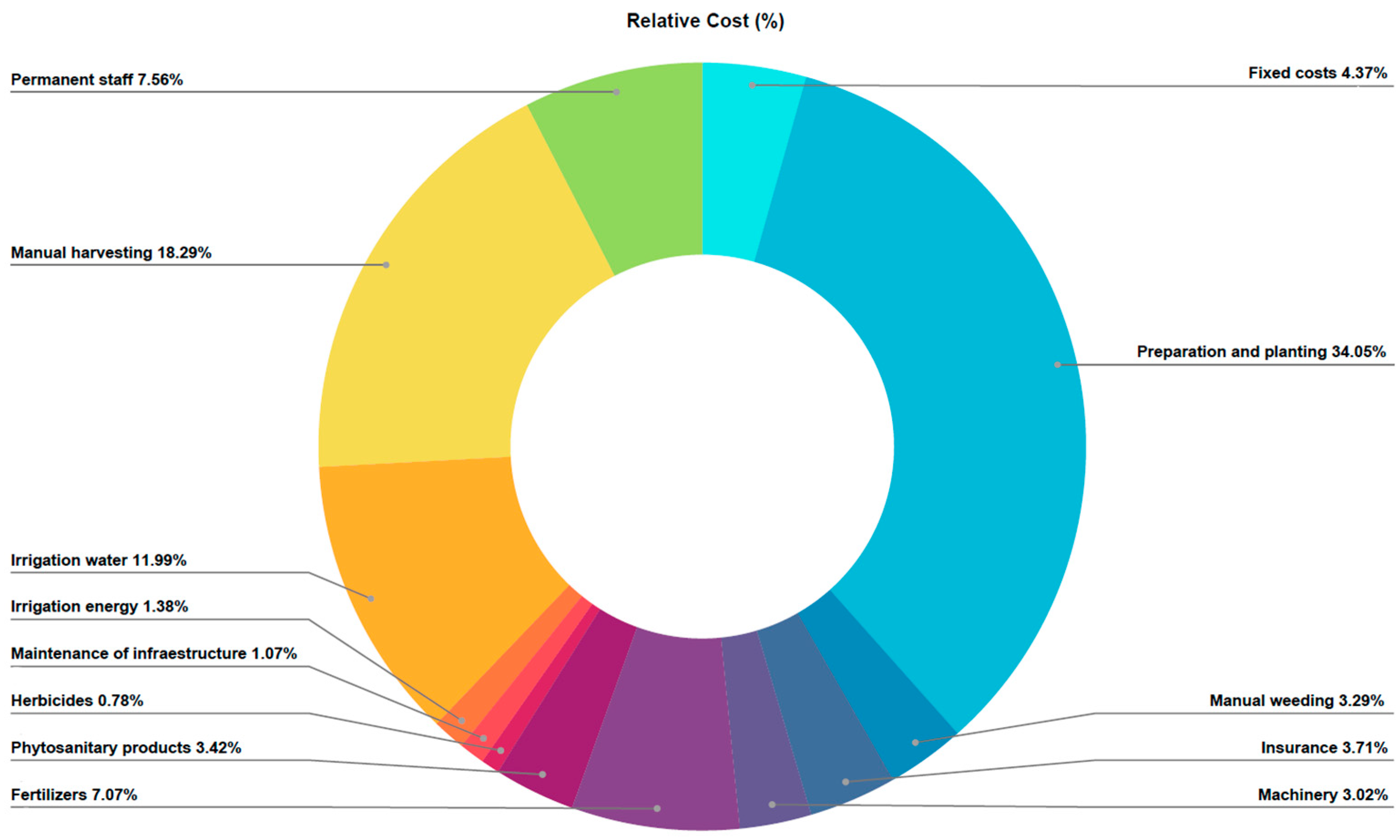 36]. Based on previous studies, a review and an update of the cultivation system have been carried out. Prices have been updated from the IMIDA Bioeconomy Team internal database, which includes unit prices of inputs, yields, costs, and technical and economic data for a wide range of crops, derived from in situ surveys as mentioned above.