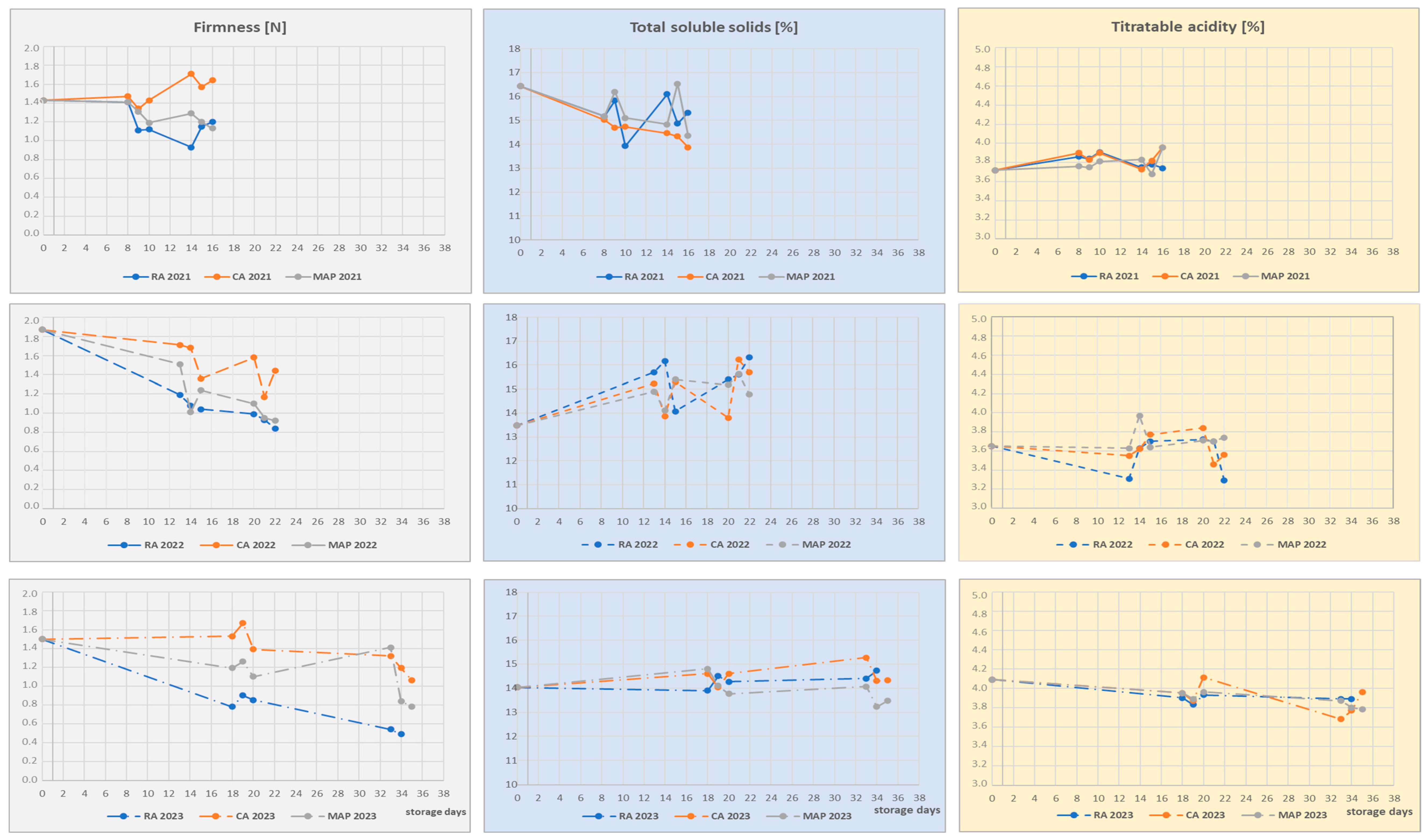 | 13 days | RA CA MAP | 0 days—no SL 1 day at 18 °C 2 days at 10 °C | Respiration parameters Physicochemical parameters Content of sugars and bioactive compounds Sensory quality |