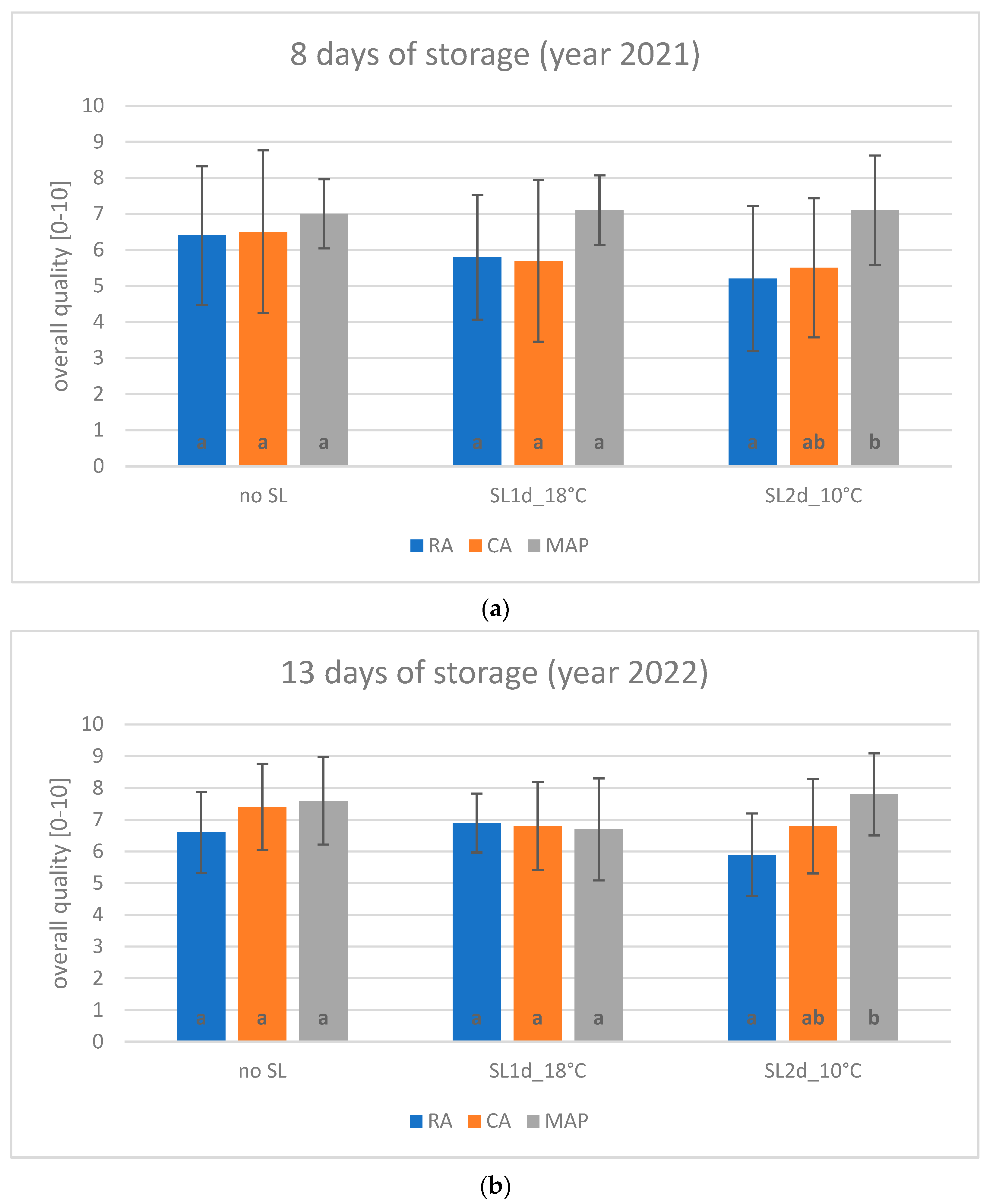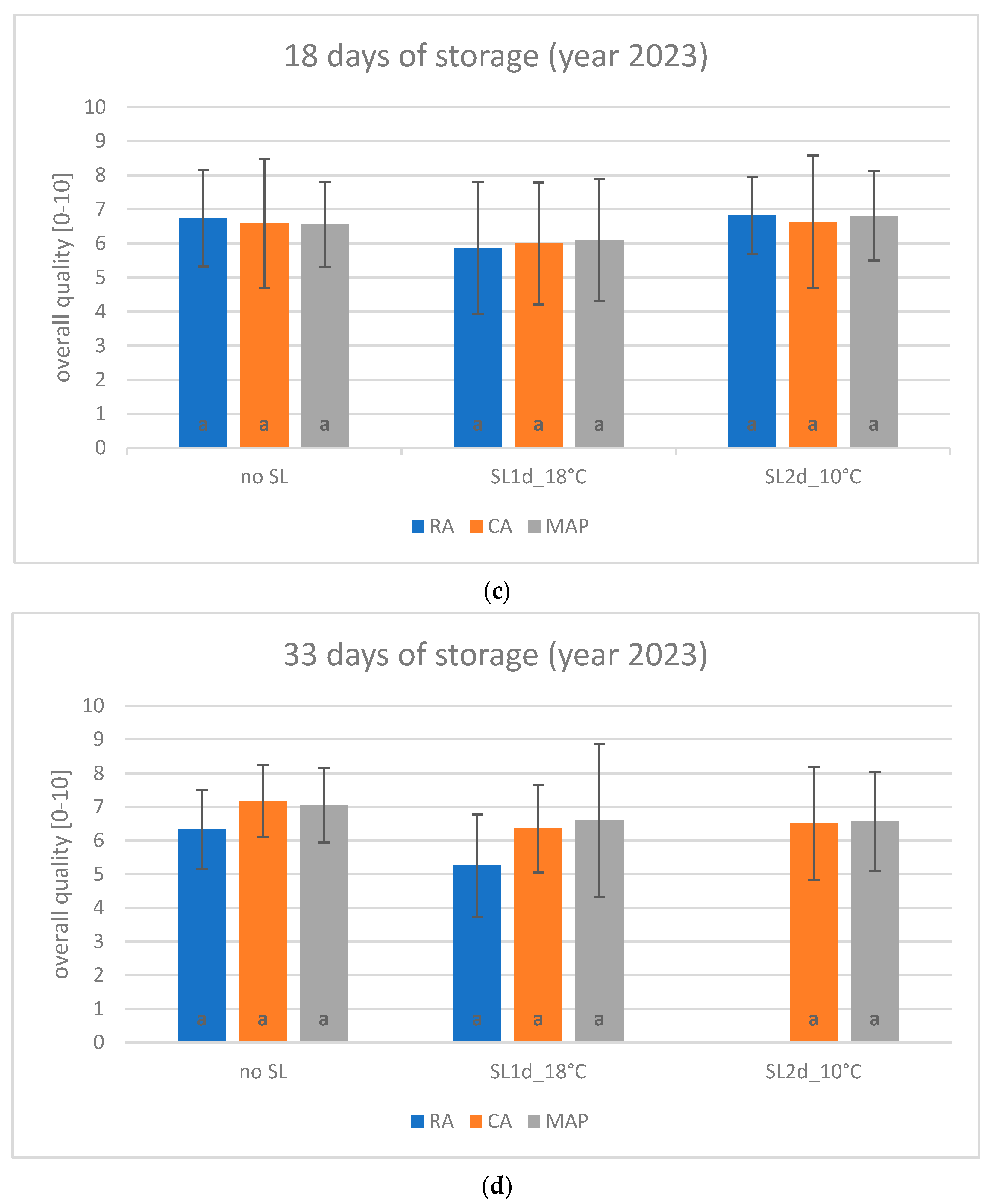 | 14 days | RA CA MAP | 0 days—no SL 1 day at 18 °C 2 days at 10 °C | Physicochemical parameters |