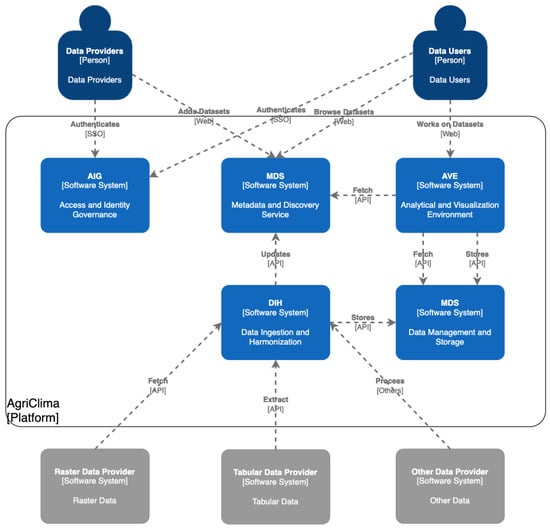 Several initiatives have aimed to reduce agricultural data fragmentation through platform development, each differing in scope and approach from agriclima. Many of these platforms have limited interoperability and struggle with spatiotemporal integrated analyses due to inconsistent formats, lack of standardized metadata, and siloed governance. They often catalog public datasets while incorporating restricted or commercial data, with integration methods varying from simple federation to partial adherence to FAIR principles. For instance, the CGIAR Platform for Big Data in Agriculture [] is a global initiative that aims to leverage big data technologies for agricultural research, offering solutions for interoperability, data sharing, and analytical automation across CGIAR partners. Although the platform emphasizes data sharing and FAIR compliance, actual operational integration across public and private-sector datasets is limited. Another example is agINFRA [], an EU-supported research data hub designed to facilitate the sharing and discovery of agricultural, food, and environmental datasets via open standards and metadata registries. With a focus on the catalog, direct integration of heterogeneous datasets for seamless spatiotemporal analysis is limited. AgYields [] is New Zealand’s national pasture and crop yield database, operating at the country scale and aggregating historical and contemporary records from multiple sources across New Zealand. It enables meta-analysis and modeling of crop productivity and resilience at regional and national scales within New Zealand. However, this platform focuses on harmonized yield and pasture data, and its integration of external data sources or support for dynamic, multi-thematic analyses (e.g., combining climate and insurance risk data) is limited.