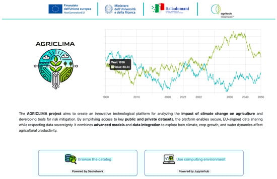 The agriclima platform was developed within a collaborative research project funded by Bando Spoke 4 WP 4.3 Agritech (CUP C93C22002790001) under Spoke 4 of the Centro Nazionale per le Tecnologie dell’Agricoltura, Italy (see the project website: https://agriclima.openiotlab.eu/, accessed on 4 November 2025). Conducted over ten months, from January to October 2025, the project brought together a consortium of 10 partner organizations representing diverse expertise and perspectives. The consortium included research institutions such as universities and research centers contributing scientific knowledge in agronomy, hydrology, climate modeling, and remote sensing; technology providers offering meteorological data, phenology models, insurance data, and technical infrastructure; government agencies responsible for agricultural policy, water resource management, and spatial data infrastructure; and end-user organizations including agricultural consortia and associations representing farmers and land managers. The data integrated within the project covered the entire national territory, with additional regional datasets focused on the Trento and Veneto regions for validation and testing within the demonstrators.