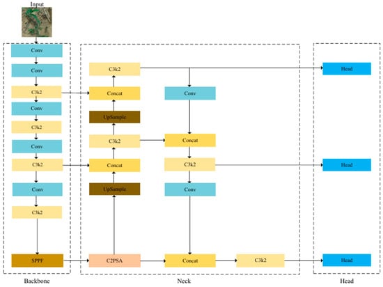 The network architecture of the YOLOv11 object detection model, released by Ultralytics, is illustrated in Figure 1. As an evolution of YOLOv8, YOLOv11 incorporates several key enhancements: the original C2f module is replaced with the C3K2 structure; a C2PSA attention module equipped with a multi-head attention mechanism is inserted after the SPPF layer []; and the two DWConv operations within the detection head are modified []. The model has also been systematically optimized for depth and width. YOLOv11 is available in five scalable versions—denoted n, s, m, l, and x—which differ significantly in parameter count. To meet the requirements for both inference speed and model lightweight-ness [], the compact YOLOv11n was selected as the baseline model.