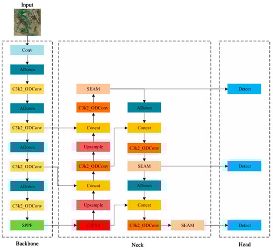 To address these limitations, we propose an enhanced model termed YOLOv11n-OSAW. The acronym “OSAW” stands for the integration of four core components: Omni-dimensional Dynamic Convolution (ODConv), Squeeze-and-Excitation Attention Mechanism (SEAM), a lightweight ADown module, and the Wise-IoU (WIoU) loss function. The overall architecture of the proposed model is presented in Figure 2.