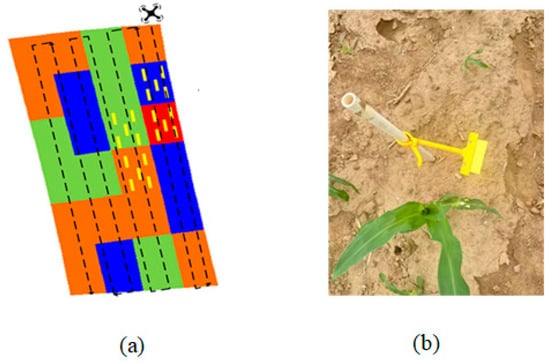 Experimental setup for collecting spray droplet deposition data. (a) Layout of the experimental plots and sampling points. The red, orange, green, and blue zones represent areas designated for 100%, 85%, 70%, and 50% of the conventional application rate, respectively. Yellow markers indicate the positions of water-sensitive papers (WSPs) placed according to the five-point sampling method. (b) The method for fixing a WSP horizontally at canopy height using a clip on a PVC pipe, ensuring standardized collection of spray droplets.